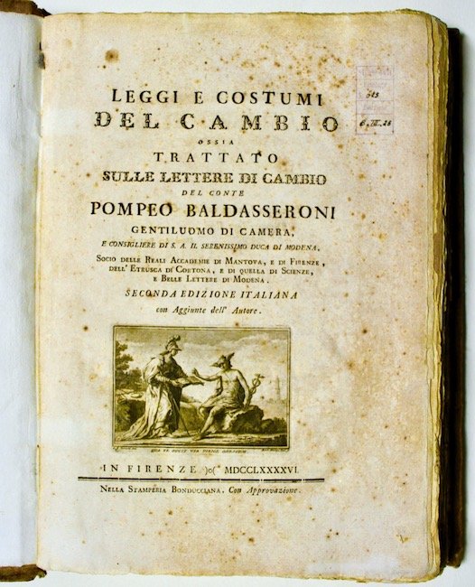 In 4° (mm 310x220) Pagg. (4), 475. Vignetta allegorica in rame incisa da G.N. Terreni al frontespizio. Cartone rustico coevo. Prima edizione. Baldasseroni, giureconsulto livornese, nominato nel 1766 segretario per la Sanità Dogane e Decime in Livorno, lasciò nel 1768 la città di Livorno per ricoprire la carica di segretario del governo di Siena, carica che abbandonò nel 1775 per tornare a Livorno. Per volere della duchessa di Massa e Carrara, scrisse un regolamento sulle lettere di cambio per il territorio delle due città, approvato nel 1782. L'opera è particolarmente interessante per la precisione e chiarezza applicata ad un settore che per i contemporanei dell'autore doveva risultare assai controverso e regolato prevalentemente dalla consuetudine. Seconda edizione, la prima è del 1784, Pescia, Tommaso Masi. Buon esemplare in barbe. Presenta saltuari ossidazioni che si accentuano a talune pagg. Kress Italian 525