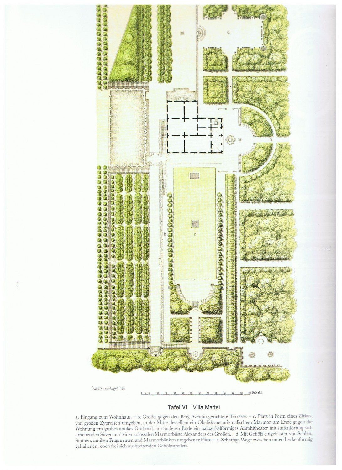 In-folio (mm. 390x285), cartonato editoriale (dorso rinforzato in tela), pp. VIII,252 (testo e numerazione delle pagine su due colonne), grande vignetta silograf. al frontespizio. L'opera è illustrata da 96 figg. nel testo inc. su legno e 25 belle tavole litograf. fuori testo, di cui 2 a doppia pagina e 14 a colori, che raffigurano giardini, tra cui: Plan vom Tuscum des Plinius - Villa Aldobrandini zu Frascati - Villa Mattei und Villa Albani zu Rom - Villa d'Este zu Tivoli - Plan der Garten, etc., etc.. Seconda edizione migliorata di una delle opere classiche sullarte dei giardini paesaggistici del XIX secolo, in cui viene prestata particolare attenzione all'esecuzione pratica di giardini e parchi.Johann Heinrich Gustav Meyer (14 January 1816, Frauendorf - 27 May 1877, Berlin) often just referred to as Gustav Meyer, was a German landscape architect and garden historian. As director of the gardens in the city of Berlin he designed parks and green areas for the city and use by the citizens. He also wrote a gardens manual "Lehrbuch der schönen Gartenkunst: mit besonderer Rücksicht auf die praktische Ausführung von Gärten und Parkanlagen" (1873) which included a historical view on gardening styles from Arabia, China, England, Italy, France and Holland.Meyer trained at the Royal Gardening School in Potsdam under Peter Joseph Lenné and others. He worked on the planning of gardens, landscape photography and designed several gardens around Potsdam on orders from Frederick William IV. The style of gardening is called the Lenné Meyer school and used both geometric forms and free-form styles. He was appointed as court gardener in 1859. On July 1, 1870 he was appointed garden director of Berlin. His work included the design of Treptower Park and Humboldthain in which he used Humboldt's idea of using vegetation from different parts of the world.Bellesemplare..