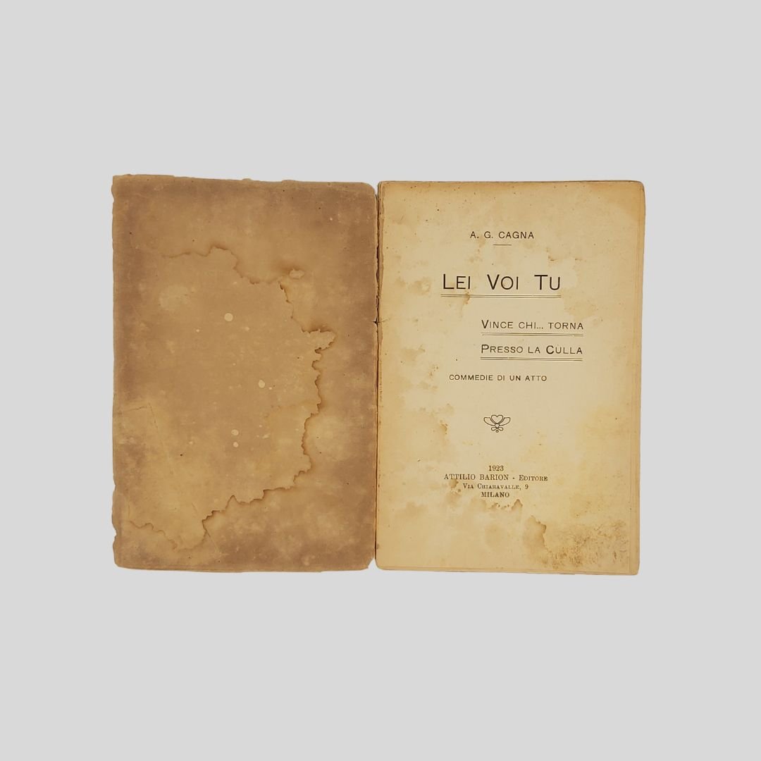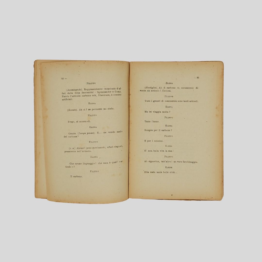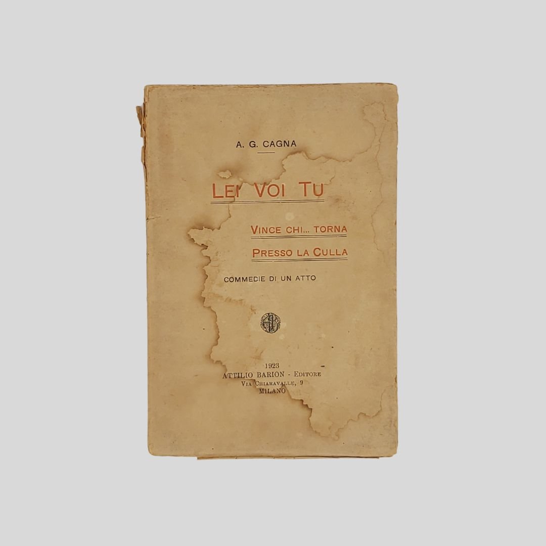 in-16° (cm 19), pp. 157. Tracce d’uso, alone alle copertine e al frontespizio, menda al dorso. Tre atti unici con una lettera introduttiva di Giannino Antona-Traversi.