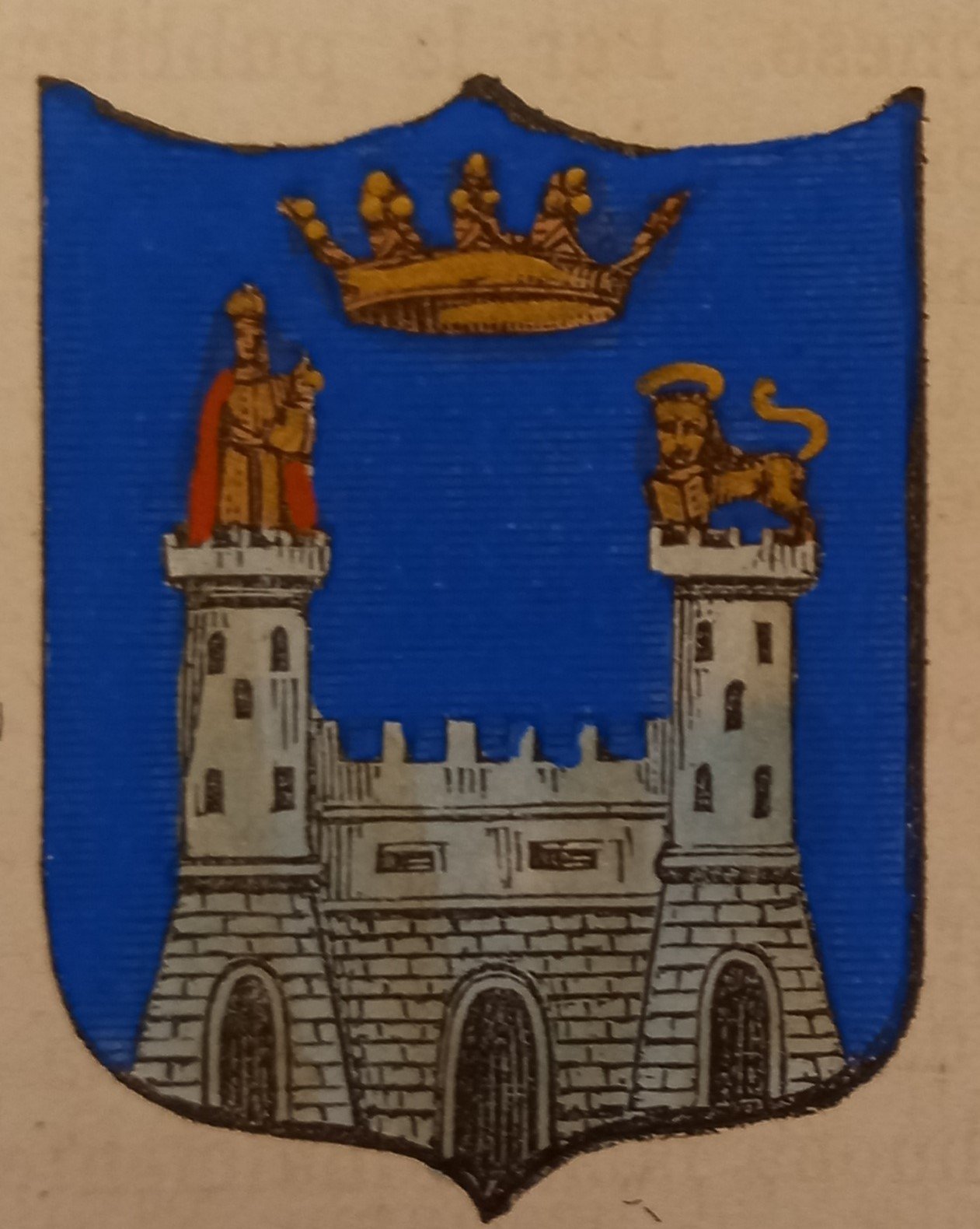 Piccolo stemma comunale colorato a mano d’epoca (cm. 3,8 x 3,2 ca.). Stralcio dal Dizionario Corografico illustrato dell’Italia, edito a Milano nel 1868. Ogni stemma di questa raccolta è inserito in una o più pagine di testo con la descrizione della località, notizie storico - geografiche e statistiche (numero degli abitanti e degli elettori, guarnigioni della Guardia Nazionale, ecc.). Spesso il testo è redatto da studiosi locali o dai sindaci, con maggiori, interessanti notizie.