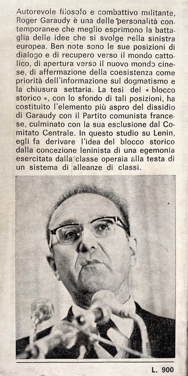 Autorevole filosofo e combattivo militante, Roger Garaudy è una delle personalità contemporanee che meglio esprimono la battaglia delle idee che si svolge nella sinistra europea. Ben note sono le sue posizioni di dialogo e di recupero verso il mondo cattolico, di apertura verso il nuovo mondo cinese, di affermazione della coesistenza come priorità dell'informazione sul dogmatismo e la chiusura settaria. La tesi del blocco storico, con lo sfondo di tali posizioni, ha costituito l'elemento più aspro del dissidio di Garaudy con il Partito comunista francese, culminato con la sua esclusione dal Comitato Centrale. In questo studio su Lenin, egli fa derivare l'idea del blocco storico dalla concezione leninista di una egemonia esercitata dalla classe operaia alla testa di un sistema di alleanze di classi.