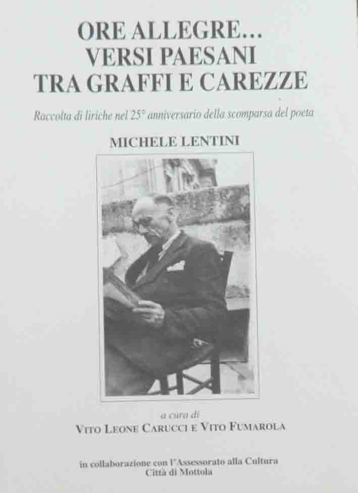 Michele Lentini, Ore allegre… versi paesani tra graffi e carezze. Raccolta di liriche nel 25mo anniversario della scomparsa del poeta, a cura di Vito Leone Carucci e Vito Fumarola, s.n., Mottola (Taranto) 2004, pp. 192, ill. b.n., cm 22, br. ed. Perfetto.