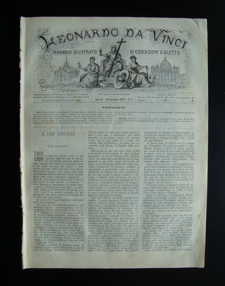 Periodico illustrato, Leonardo Da Vinci" Anno II - 19 Settembre 1878 N. 6 Al Lago Scaffaiolo Tip.dell'Osservatorio Cattolico, 1878; cm 37x27, da pag.62 a pag.72 (numerazione annuale) con qualche ill. in bella grafica in b/n nel testo. Numero completo. Condizioni di conservazione Esemplare in buonissime condizioni con leggere tracce d'uso e del tempo; dorso con alcune minuscole mancanze e parzialmente fessurato per distacco da volume rilegato. 4 pagine di Pier Biagio Casoli : Al Lago Scaffaiolo Gita Apenninica. Bella e inedita disamina di un viaggio allora quasi avventuroso. Numero completo. SC03.D14155 blu "