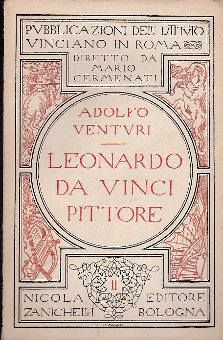 In-8°, pagine (4), 196, (4). brossura editoriale con titolo in rosso e nero ed illustrazioni e fregi in ocra e in nero di A. Moroni. All'antiporta, riproduzione a sanguigna del celebre autoritratto della Biblioteca Reale di Torino. 129 tavv. f.t. Prima edizione di questo studio sulla pittura leonardesca di Adolfo Venturi (Modena, 1858-Santa Margherita Ligure, 1941), uno dei nostri massimi storici dell'arte. Pubblicazioni dell'Istituto Vinciano in Roma diretto da Mario Cermenati, II.