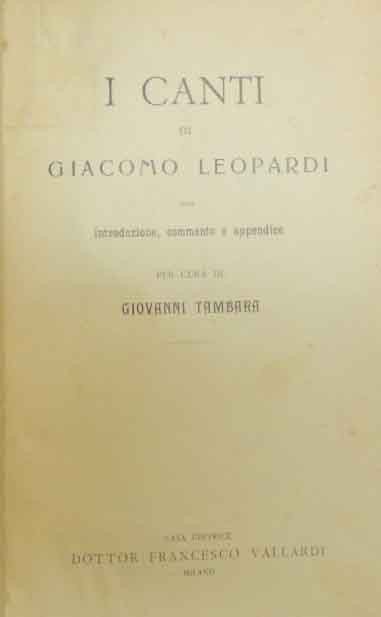 Giacomo Leopardi, I canti, con introduzione, commento e appendice per cura di Giovanna Tambara, Casa Editrice Dottor Francesco Vallardi, Milano s.d. (ma dopo il 1906), pp. XLIX, 338, cm 19, legatura in mezza tela muta con titolo manoscritto al dorso. Segnatura di collocazione alla prima pagina e alla pagina dell’indice. Lievissime tracce d’uso al dorso, qualche segnetto di biro e pastello, piccola menda al frontespizio, per il resto ben conservato.