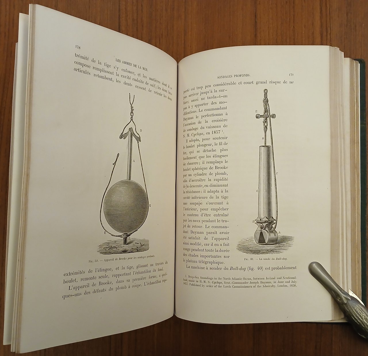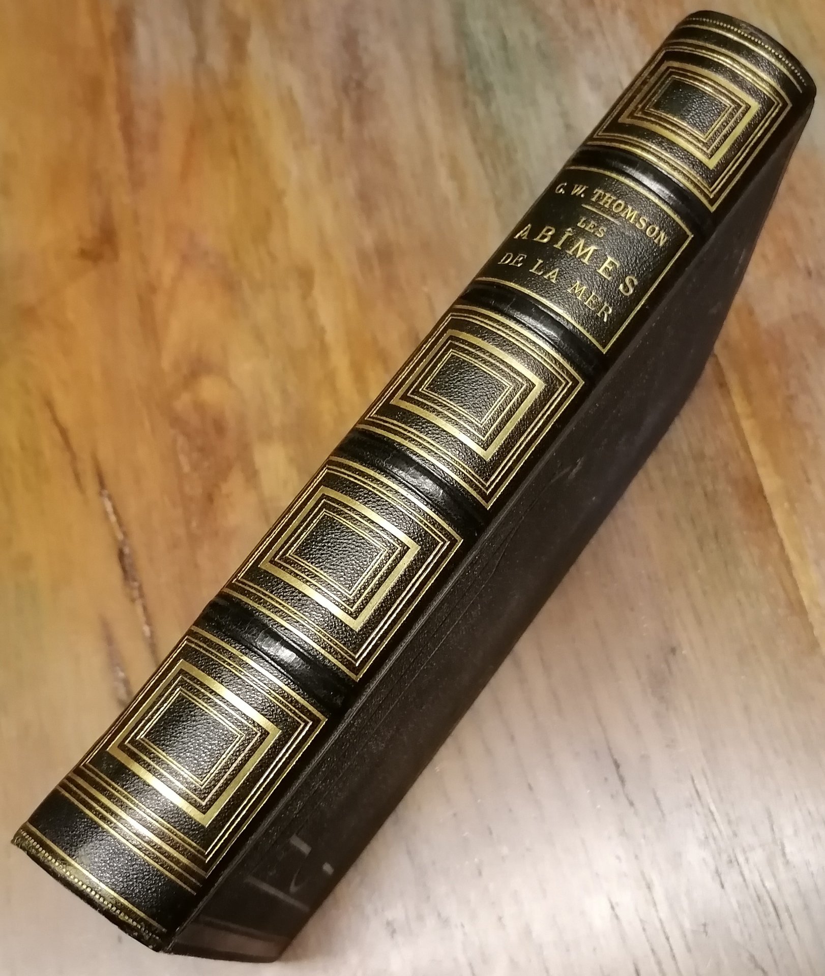 (Oceanografia; Biologia marina; Esplorazioni abissali; Atlantico del Nord; Mediterraneo) In 8°, legatura coeva in mezza pelle nera, dorso a 4 piccoli nervi con titoli ed impressioni in oro, piatti in percallina con cornici impresse a secco, tagli dorati, pp. XXVII,(1),454,(4), con 94 illustrazioni xilografiche nel testo e 8 tavole fuori testo (una carta geologica e sei carte geografiche a doppia pagina a colori, un diagramma più volte ripiegato). Stato di conservazione molto buono.