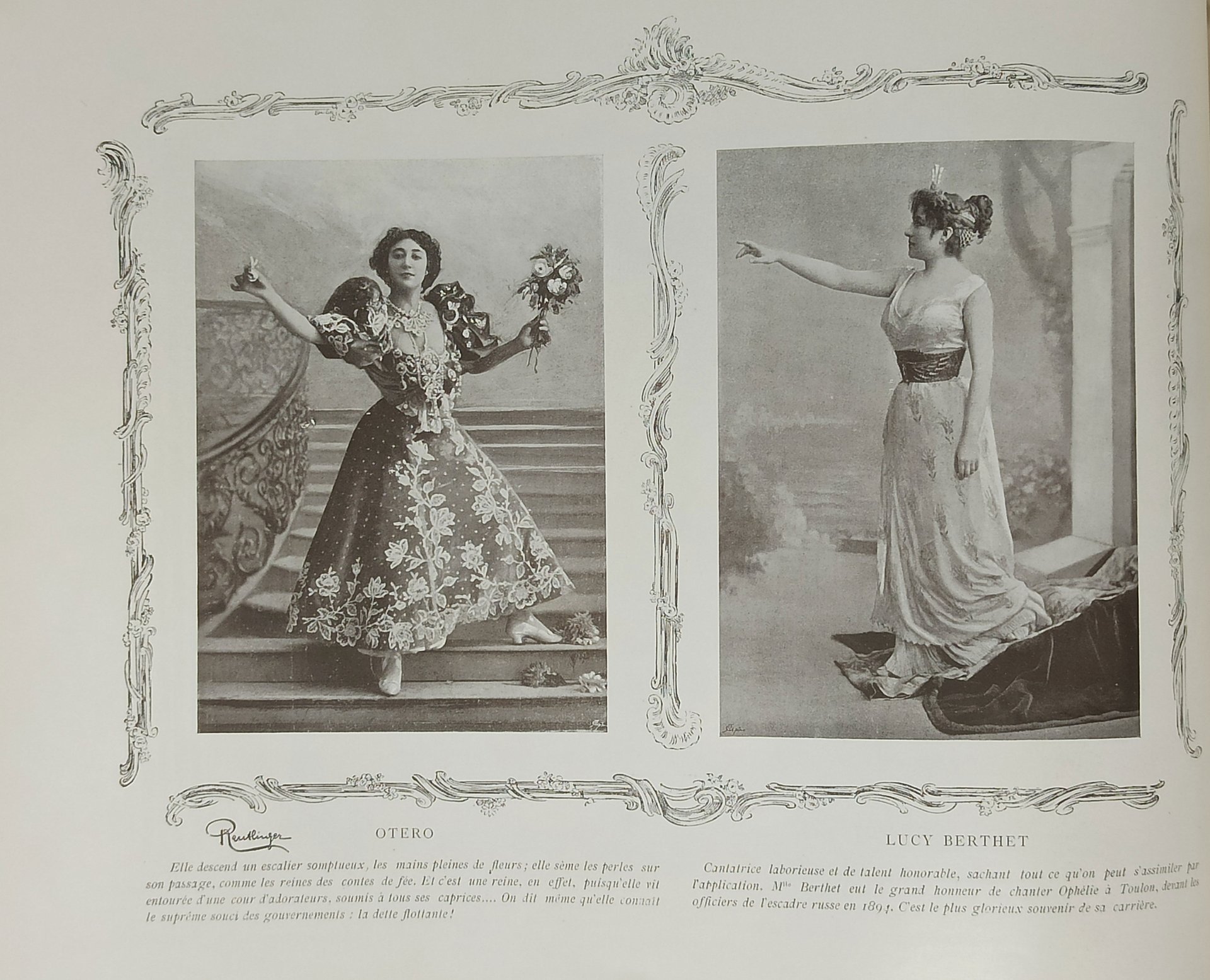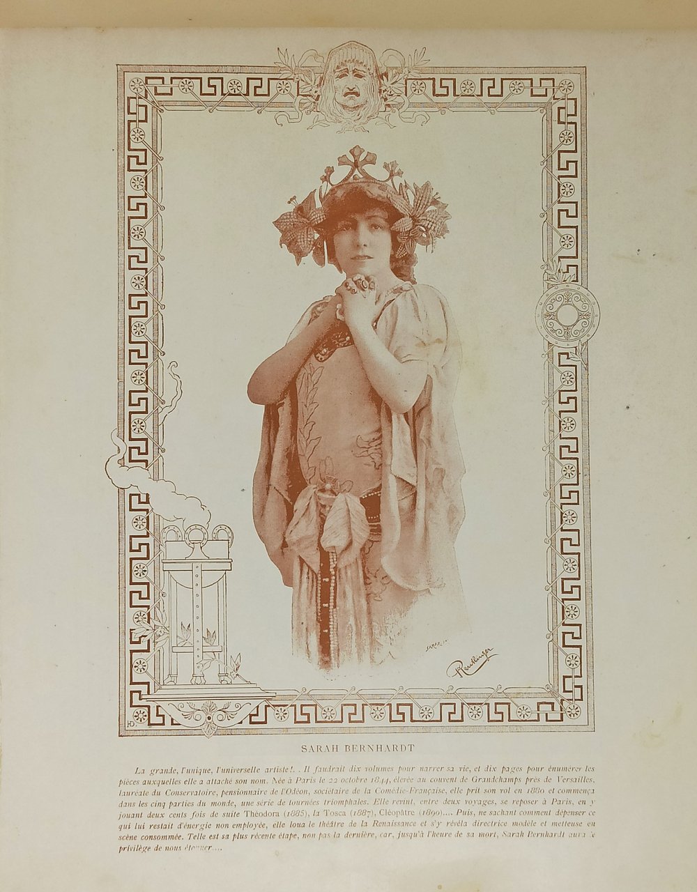 ALBUM FOTOGRAFICO (a stampa).130 fotografie dei grandi fotografi parigini d'epoca: Reutlinger e G. Camus. Album fotografico con le immagini delle principali attrici, operanti nei teatri parigini. Sotto ciascuna immagine fotografica sono riportati, in lingua francese, alcuni cenni biografici, riguardanti i soggetti ritratti. Opera non datata ma, dalle didascalie, si deduce essere stata stampata, negli ultimi anni dell'800. Pagine non numerate (80 in totale). Dimensioni: 35 x 28,5cm circa. Stato di conservazione: Qualche usura (soprattutto evidente sugli spigoli) ed abrasioni sulla coperta ma interno decisamente fresco e ben conservato. Un esemplare decisamente buono, privo di scritte o altri segni di penna o di matita. Sono presenti circa 130 fotografie stampate all'interno di belle cornici in motivo Liberty. Elenco delle fotografie delle attrici presenti:; Sarah Bernhardt (su piena pagina), Marguerite Ugalde, Jeanne Bertiny, Cléo De Mérode (su piena pagina), Emma Calve, Méaly et Emilienne D'Alencon, Marthe Brandés (su piena pagina), Eugénie Yahne, La belle Otero, Germaine Gallois, Eugenie Buffet, Théo et Saulier, Jeanne Saulier, Gabrielle Réjane-Porel (su piena pagina), Valentine Valty, Saint-Cyr, Liane De Pougy, Cécile Sorel, J. Demarsy, Andrée Ciriac, Sybil Sanderson (su piena pagina), Marguerite Nebbia, Biana Duhamel, Wanda De Boncza (su piena pagina), Dieterle, Simon Girard, Emma Calvé (su piena pagina), Derville, Hélène Murany, Rose Caron (su piena pagina), Louise Bréval, Avril, Yvette Guilbert (su piena pagina), Renée De Presle, Thomsen, Miss Ethel Ross Selwicke, Carrère-Xanrof, Anna Judic, Sorel (su piena pagina), Cléo de Mérode, Chabot, Jane Harding, Jeanne Ludwig, Marie Fériel, Jeanne Granier, Jane Demarsy (su piena pagina), Otero, Lucy Berthet, Gabrielle Réjane (su piena pagina), Jeanne Darlaud, Jane Pierny, Marcelle Lender (su piena pagina), Suzanne Elven, Simone Damaury, Julia Depoix (su piena pagina), Angele Héraud, Mathilde Auguez, Alice Dufrene (su piena pagina), Sorel, Aimée Martial, Melba, Lucy Gerard, Loellia Froissard, Valérie Colbert, Jane Hading (a piena pagina), Marguerite Caron, Suzanne Dalbray, Anna Held (due diverse foto su un'unica pagina), Marie Delna, Rosa Bruck, Héglon (su piena pagina), Lavalliere, Miss Ethel Ross Selwicke, Raphaele Sisos (su piena pagina), Jane Pierny, Nebbia, Julie Bartet (su piena pagina), Blanche Pierson, Magnier, Jeanne Bertiny (su piena pagina), Suzanne Devoyod, Blanche Baretta, Delna (su piena pagina), Francine Decroza, Suzanne Reichenberg, Cheirel, Bonheur, Segond-Weber, Duclerc, Fége, Mégard, Mily Meyer, Paulette Filliaux, Jane Marcy, Chassaing-Taride, Marie-Louise Marsy, Emma Eames, Lucienne Bréval (su piena pagina), Fougere, Blanche Dufrène, Yahne (su piena pagina), Cassive, Tessandier, Demarsy (su piena pagina), Alice Dufréne (due diverse foto su un'unica pagina), Suzanne A vril (su piena pagina), Sanderson, Burty, Lucy Gérard (su piena pagina), Yahne, Drunzer, Newa Cartoux, Frémaux, Felicia Mallet, Peyral, Suzanne Munte (su piena pagina), Réjane, Cerny, Lynnès, Lainé Luguet, Héglon, Nancy Martel, Emilienne D'Alencon (su piena pagina), Gabrielle Barrot, Maria Legault, Andrée Ciriac (su piena pagina), Henriette De Mongey (due foto su un'unica pagina). BELLISSIMO E RARO ALBUM DA COLLEZIONE.