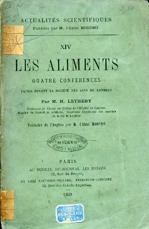 Les aliments. Quatre conférences faites devant la société des arts de Londres par M.H.Letheby. Traduites de l'Anglais par M. l'Abbé Moigno