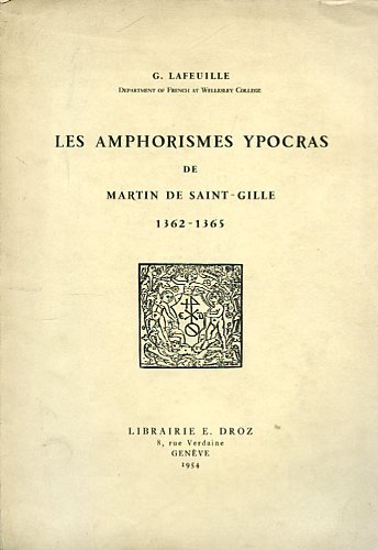 In-8°, pp. 165, (3), brossura editoriale con vignetta xilografica tratta da un'edizione antica. 4 tavv. f.t. riproducenti un codice contenente gli 'Amphorismes'. Intonso, in bello stato. Studio sulla prima traduzione francese degli 'Aforismi' di Ippocrate, realizzata ad Avignone fra il 1362 e il 1365 da Martin de Saint-Gille, 'texte dont l'importance, pour l'histoire de la langue médicale, est comparable à celle des traductions de Nicole Oresme pour l'histoire de la lanhue astronomique'. All'introduzione della Lafeuille seguono il testo integrale della versione del Saint-Gille, appendici filologiche, un glossario ed un indice.