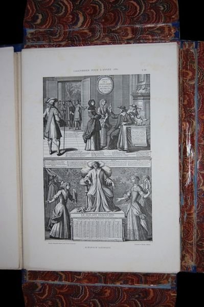 In folio; (4), 136 pp. e 50 c. di tav. fuori testo. Astuccio editoriale in mezza tela blu con titolo impresso in nero al piatto anteriore. Completo. Qualche lievissima arrossatura in due carte dovuta alla qualità della stessa e nel complesso esemplare in buone-ottime condizioni di conservazione ed ancora a fogli chiusi e nella sua versione di custodia originale. Prima edizione in buone-ottime condizioni di conservazione, di questo importate e curioso studio del noto critico darte francese Victor Antoine Champier (3 ottobre 1851 - 1929), dedicato alla storia, iconografia e funzione dei calendari e degli almanacchi attraverso i secoli. Lopera presenta 50 bellissime tavole realizzate da alcuni dei più celebri illustratori del tempo quali Léonard Gautier, Crispin de Passe, Abraham Bosse, De Larmessin, Lepeautre, Cl. Audran, Gravelot, Cochin, Quévardo, Dorgez, Debucourt, Devéria, etc. Lopera presenta capitoli dedicati alle origini dei calendari con note sui calendari egizi, greci, romani, mussulmani e israelitici,ì; Les almanaches ou Composts des Bergers; gli almanacchi letterarim profetici, satirici, politici; Catalogue des Principaux livres-almanachs illustres de 18685 a 1823 conn numerose note bibliografiche ed altro ancora. Opera curiosa e non comune.