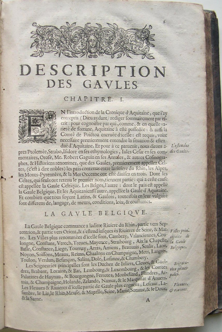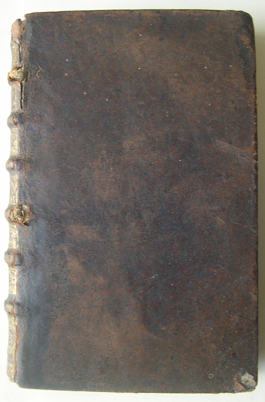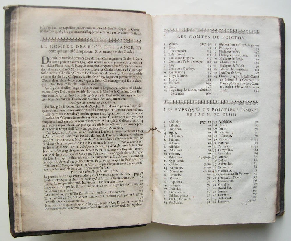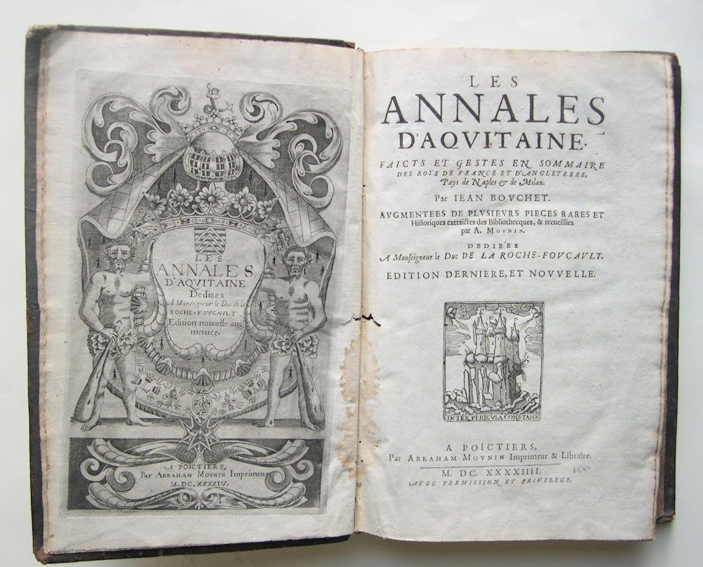 A Poitiers, par Abraham Mounin, Imprimeur & libraire, 1644. Grand in/4 reliure plein veau du temps, dos à nerfs à caissons dorés, frontispice gravé, vignette en page de titre, planche (portrait de François de la Roche Foucault), bandeaux, lettrines historiées, 19 f., 666 p. Dos abîmé : coiffe inférieure manquante, supérieure partiellement manquante, cuir coupé sur le dos, 3 nerfs très usés laissant apparaître les liens, coins très usés, auréole sur la bordure centrale des 13 premiers feuillets, galerie d’insecte décroissante en marge intérieure des 11 premiers feuillets, passages soulignés jusqu’à la p. 270, des fantaisies de pagination (sans manque de texte). BOUCHET Jean, poète et écrivain Français, né à Poitiers, en 1476, mort vers 1550 , montra de bonne heure un véritable talent pour la poésie. A peiné âgé de vingt ans, il présenta, en 1496, à Lyon, quelques-unes de ses productions à Charles VIII. La peste s'étant déclarée à Poitiers, il se retira à la campagne, où il produisit de nombreux ouvrages en vers et en prose. Doué d'une vive imagination, et écrivain d'une extrême fécondité, Jean Bouchetfut le premier poète qui se soit astreint, dans la plupart de ses vers, au mélange alternatif des rimes masculines et féminines.Big 4to in contemporary full calf, ribbed spine, engraved frontispiece, vignette in title page, plate, head-piece, historical lettersz, [19], 666 p.Flaws : spine damaged with tips lacking, joints partially cracked with heavy wears, rubbed corners ; waterstain on 13 first sheets, decreassing wormholes on inner margin of the 11 first sheets, marginalia (underlinings) till 270 p.