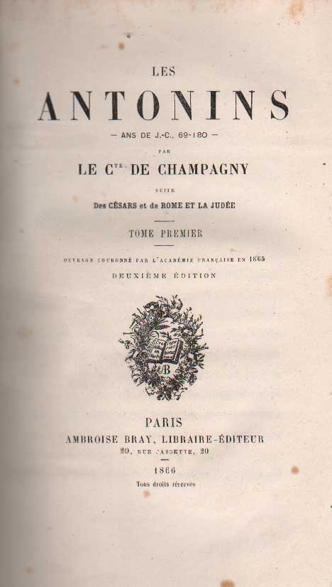 In-8 (mm. 215x135), 3 volumi, tela coeva, titolo oro al dorso (piccoli spacchi), ai piatti iniziali in oro "D.S." (Duchessa di Sorrentino), pp. VII,487; 528; 446; con 2 tavole genealogiche fuori testo, più volte ripiegate. Con lievi fioriture, peraltro ben conservato (slightly foxed, otherwise good condition).<br>De Champagny storico e biografo francese dell'800, specializzato in storia dell'Impero romano.