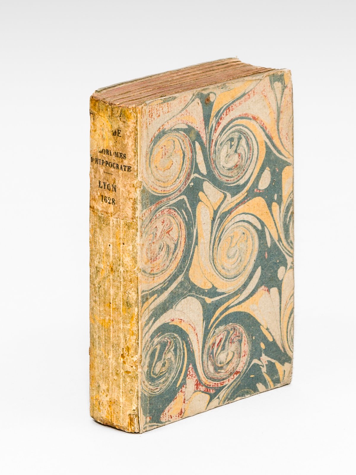 Traduicts de Grec en François par M. I. Breche, Avec Annotations sur ledict premier livre ensemble certaines Paraphrases servans de brief commentaire, depuis le second livre, iusques à la fin du septième, faicts par le dict Breche. Ensemble les Aphorismes de I. Damascene, Medecin Arabe, Ensemble un Epitome sur les trois livres des Temperamens de Galien, le tout nouvellement reveu & corrigée, 1 vol. in-16 cartonnage début XIXe, Par Pierre Roussin, à Lyon, 1628, 479 pp. Signatures : A8-Z8, Aa8-Gg8 C'est Jean Brèche de Tours (1514-1583) qui avait proposé la première traduction française des Aphorismes d'Hippocrate en 1550. Etat satisfaisant (tache d'encre au f. de titre, cartonnage faible, bon état par ailleurs, ex-libris en garde). Edition lyonnaise sans doute partagée avec celle de Claude Chastellard, signalée par Maloney & Savoie, Cinq cents ans de bibliographie Hippocratique (n° 771) de collation identique.