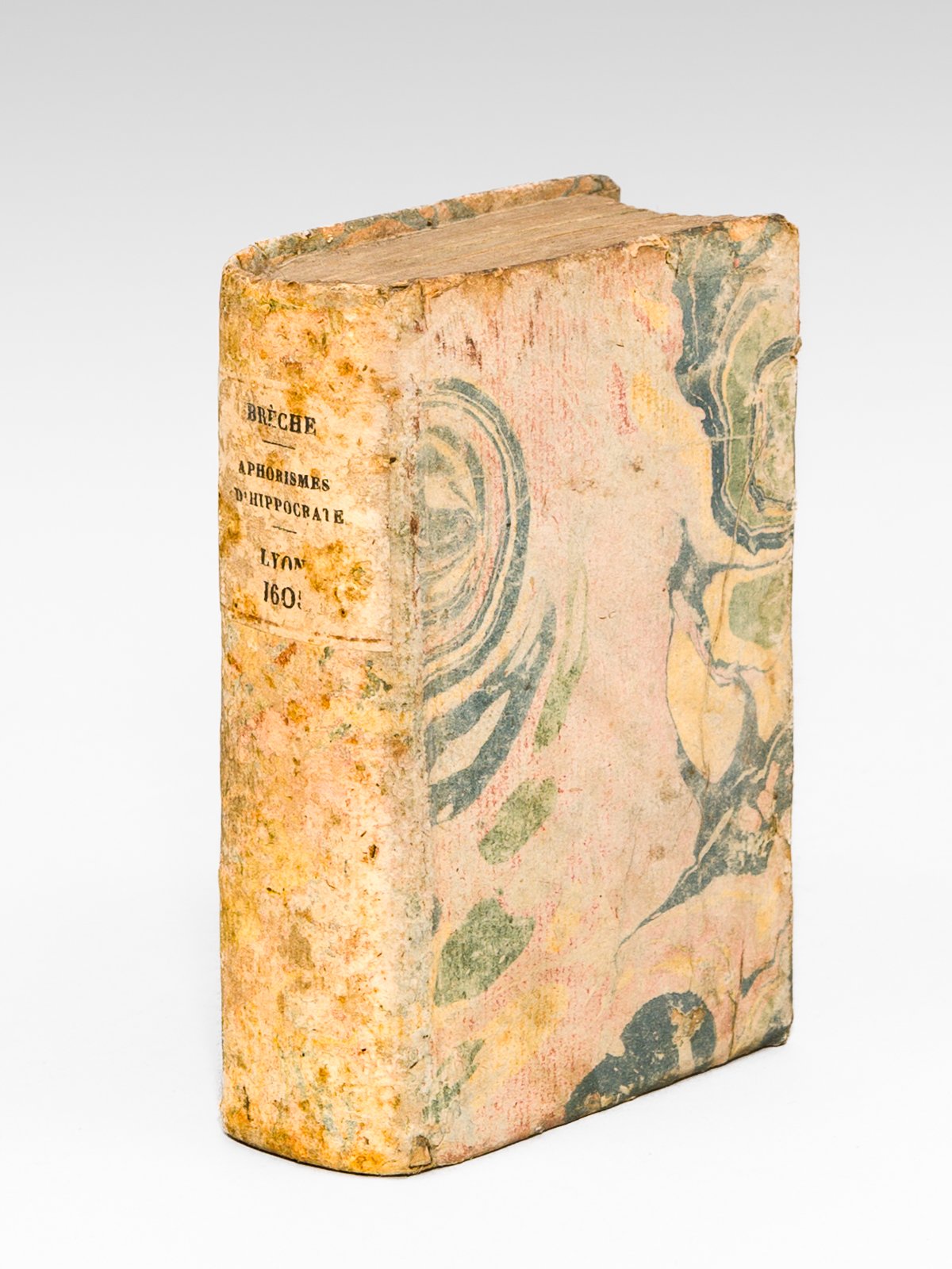 Traduicts de Grec en François par M. I. Breche, Avec Annotations sur ledict premier livre ensemble certaines Paraphrases servans de brief commentaire, depuis le second livre, iusques à la fin du septième, par le dict Breche Plus les Aphorismes de I. Damascene, Medecin Arabe, Ensemble un Epitome sur les trois livres des Temperaments de Galien, le tout nouvellement reveu & corrigé, 1 vol. in-16 cartonnage bradel début XIXe (probablement monté sur reliure de vélin), Par Jean Ant. Huguetan, à Lyon, 1605, 2 ff. n. ch., 254 ff. Signatures : A8-Z8, Aa8-Ii8 C'est Jean Brèche de Tours (1514-1583) qui avait proposé la première traduction française des Aphorismes d'Hippocrate en 1550. Bon état (cartonnage un peu frotté, rares petites mouill., bon exemplaire par ailleurs, ex-libris en garde). Maloney & Savoie, Cinq cents ans de bibliographie Hippocratique, 641