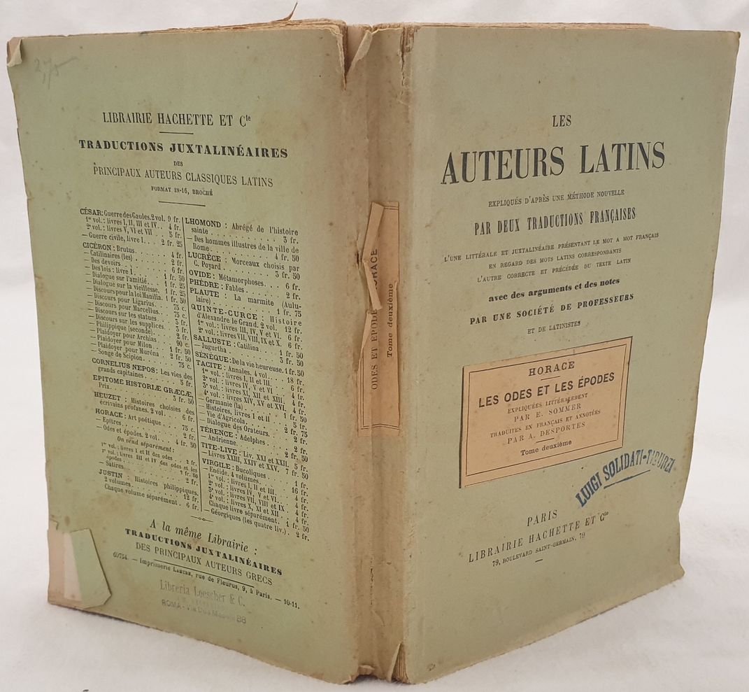 Edizione del 1910 di questa antologia di autori latini tradotti in lingua francese. Siamo in possesso solo del tomo secondo contenente le Odi ed Epodi di Orazio. Testo latino con commento in francese a cura di una Società di professori e latinisti. Alla fine supplemento del 1912 con lista di libri classici. In buone condizioni. Copertina editoriale in buone condizioni con lievi usure marginali. Legatura in buone condizioni. Pagine in buone condizioni con fioriture. In 8. 19x12 cm. Pp. 311+36. Edition of 1910 of this anthology of latin authors translated in french language. We onyl have the seocnd tome conatining the Odes and EPodes of Horace. Latin text with comment in french language by a Society of teachers and latinists. At the end supplement of 1912 with list of classic classic. In good conditions. Editorial cover in good conditions lightly worn in the extremities. Binding in good conditions. Pages are in good conditions with foxings. In 8. 19x12 cm. Pp. 311+36