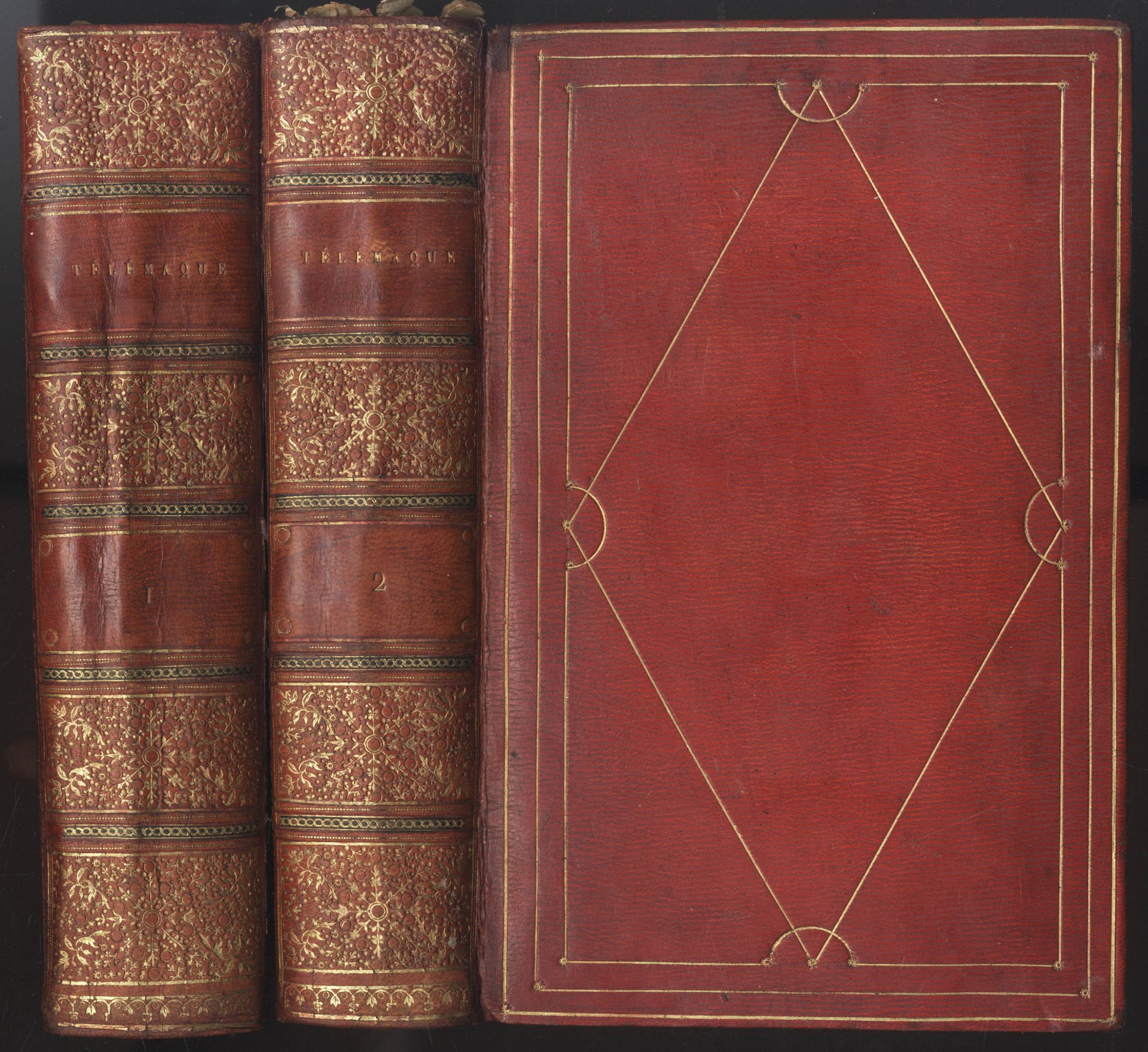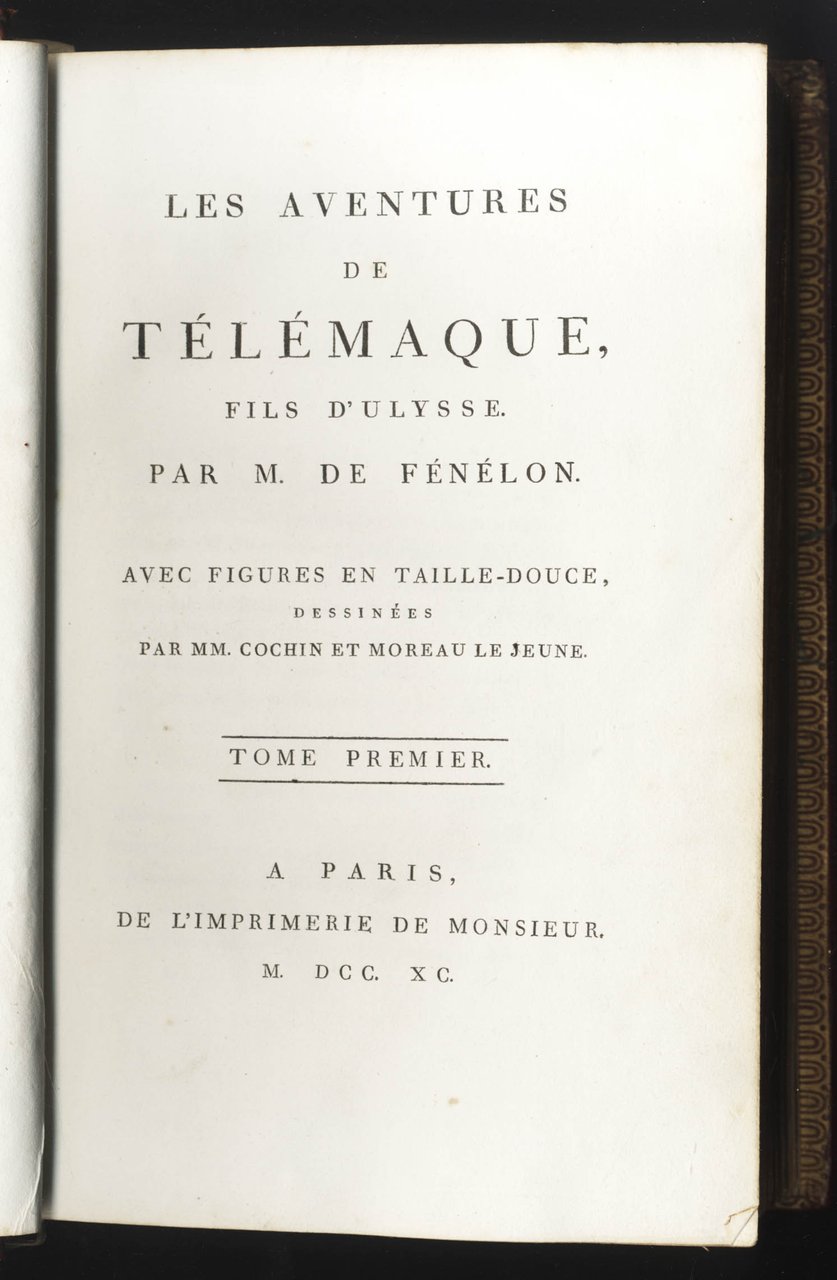 >2 volumi in-8vo grande (237x148 mm) su ''grand papier superfin velin d'Annonay'', pp. (4 con titolo e occhietto), VIII, (4), 426; (6), 408, belle legature coeve in marocchino granata a grana lunga con raffinato decoro geometrico ai piatti e floreale ai piccoli ferri ai dorsi, il tutto impresso in oro; sguardie in seta verde e dentelle in oro; al piatto anteriore del vol. I in oro nome dell'antico possessore ''F. Courpon'', tagli dorati, entro astucci in carta marmorizzata. Esemplare speciale poiché anziché avere, come indicato sul frontespizio, le sei tavole e il titolo figurato incise da Cochin, comprende la serie completa delle 72 tavole disegnate da Monnet ed incise da Tillard per l'edizione in-folio stampata da Didot nel 1783. Per adattarle al formato in-8 però vennero ritagliate le bordure e le tavole furono applicate su carta della dimensione del testo. La presente è considerata la più bella fra le edizioni in-8 di tale opera sia per la qualità della carta che per i caratteri: fu infatti stampata con il ''Saint-Augustin oeil rond et gras'' che il Didot riteneva il più elegante. Il Cohen-De Ricci cita qualche esemplare speciale di questa edizione illustrato dalle 24 figure di Marillier o con le 25 di Moreau ma nessuno con la serie delle 72 tavole come il presente. Bella e raffinata edizione illustrata del celebre romanzo pedagogico scritto da Fénélon (1651-1715) per istruire il suo allievo duca di Borgogna, nipote di Luigi XIV. Ottimo esemplare. Cohen-De Ricci 386.