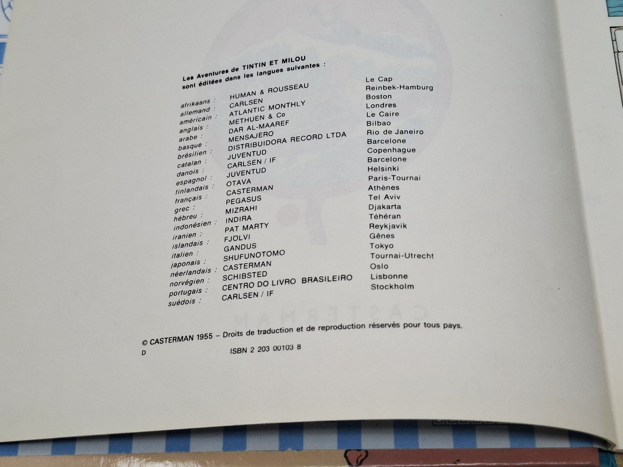 Fumetto cartonato, a colori, appartenente alla serie 'les aventures de TINTIN et MILOU'. Imprimé en Belgique. In lingua francese. Formato: 23 x 30,5 cm circa. 62 pagine. Stato di conservazione: Ottimo. privo di firme di appartenenza, abrasioni, o altri difetti. Copertina editoriale cartonata rigida, illustrata a colori.