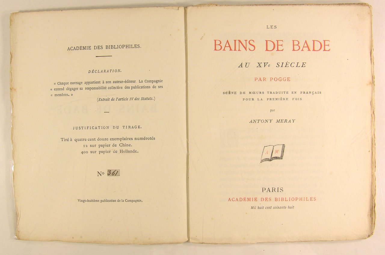 Paris, Académie des Bibliophiles, 1868. Petit in/12 carré, broché, 46 pages. Exemplaire numéroté 361/400 sur papier de Hollande. Traduction de Antony Meray.