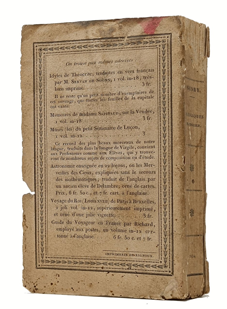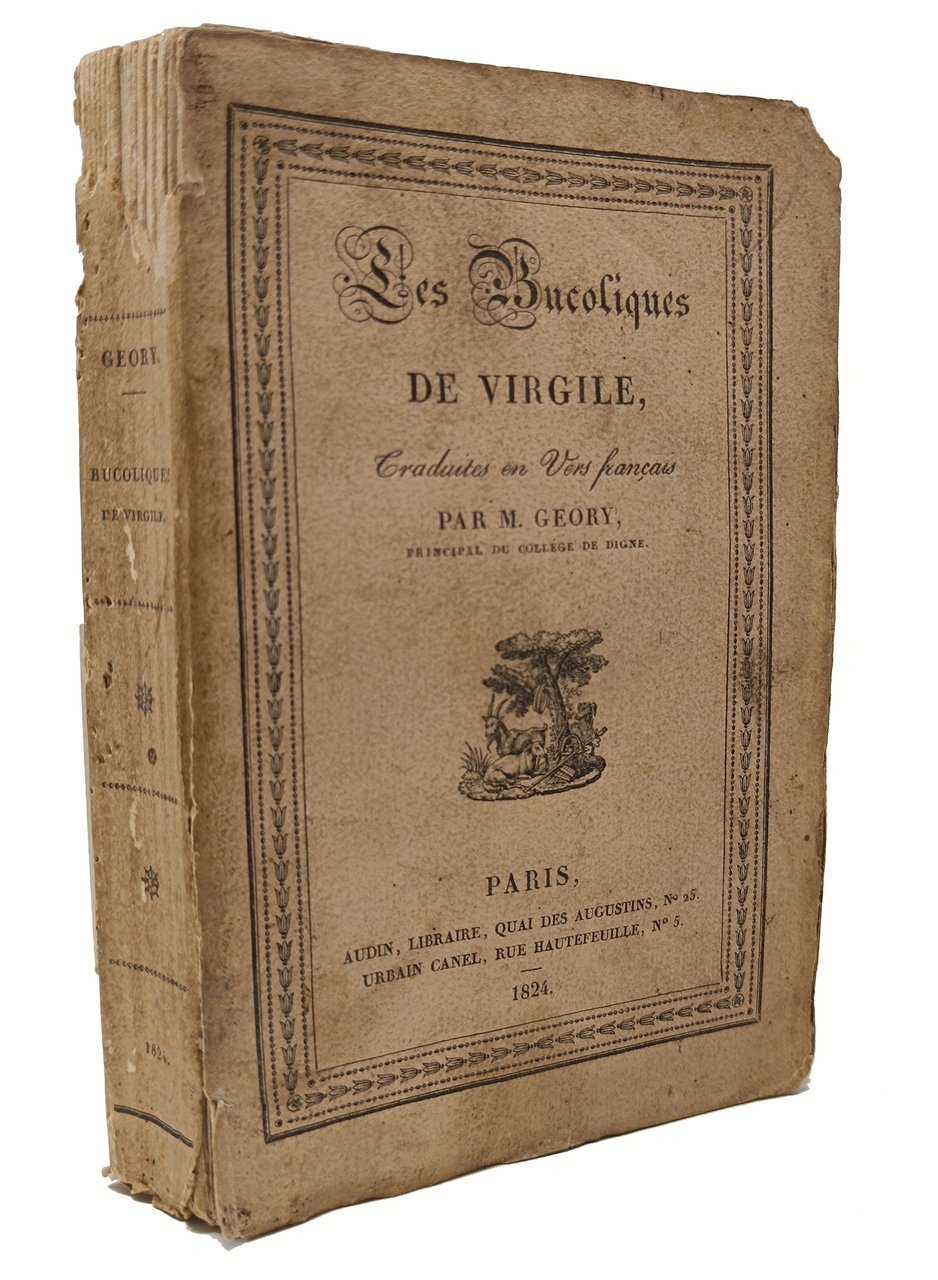 'Les Bucoliques de Virgile traduites en Vers francais par M. Geory (principal du collége de Digne)'. Paris, Audin librairie / Urbain Canel. Anno 1824. Lingua del testo: francese. Formato: 11 x 16,5 cm circa. Pagine: XII + 311. Stato di conservazione: evidente mancanza sul margine superiore del dorso, un ampio taglio sulla linea di rilegatura tra il dorso e il piatto anetriore (margine inferiore) ce riguarda ance i primi fascicoli, rilegatura un po' allentata (a causa deu difetti al dorso), piccole maccioline gialle (su qualce pagina più diffuse), una piccola mancanza sul bordo superiore bianco del foglio che contiene le due pagine 9 e 10, piccoli aloni causati da una pregressa umidità sul bordo bianco inferiore degli ultimi fogli (da pagina 261). Con piccole incisioni in nero nel testo alla fine di alcune sezioni. Brossura editoriale con copertina flessibile con piccola incisione bucolica in nero sul piatto anteriore.