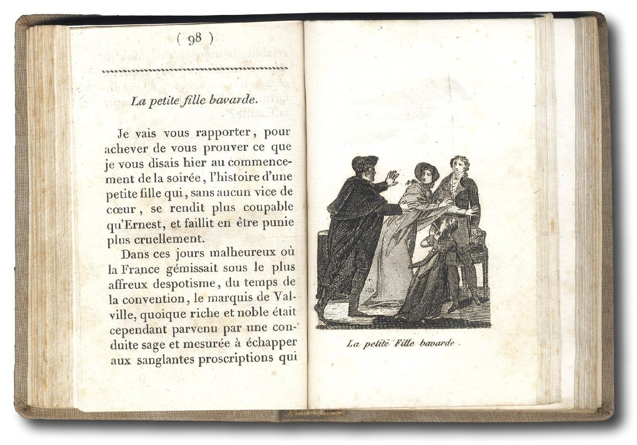 >due parti (su 4), in un vol. in-12 (mm 122x85), pp. 123; 103; legatura in tela beige, tassello granata al dorso. Bella edizione ornata da due frontespizi e 33 incisioni a p. pagina f.t. Si tratta di una raccolta di brevi racconti morali e istruttivi (Le petit méchant, Le poltron; La Curieuse, Le Grossier, Le Gourmand, La Peureuse, etc), raccontati da un padre ai suoi tre figli, che avevano trovato nella sua biblioteca un volume di Lavater illustrato. Lievi usuali bruniture.