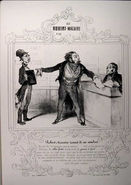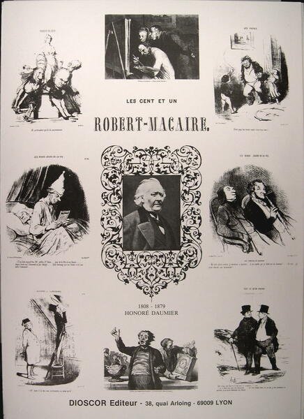 Editions Dioscor, 1984. In plano en feuilles sous chemise cartonnée et étui toile écrue, titre en noir sur le plat supérieur, 101 planches. Un des 1000 exemplaires numérotés. Reprint d’une oeuvre qui fut l’inauguration de la caricature de moeurs. Celle-ci prit une allure nouvelle, plus spécialement politique, elle fut la satire générale des citoyens. Honoré Daumier (1808 -1879), graveur, caricaturiste, peintre et sculpteur français, dont les nombreuses oeuvres commentaient la vie sociale et politique en France au 19e siècle. Dessinateur prolifique, auteur de plus de 4000 lithographies, il est surtout connu pour ses caricatures d'hommes politiques et ses satires du comportement de ses compatriotes. La Caricature cesse de paraître, mais Philipon offre un nouveau champ d’action à Daumier en fondant Le Charivari, journal qui joue un rôle important dans la vie politique de l'époque, et est spécialement dirigé contre Louis-Philippe. Daumier produit pour Le Charivari des caricatures sociales, dans lesquelles il tourne en ridicule la société bourgeoise personnifiée par la figure de Robert Macaire, héros d'un mélodrame populaire. Dans une autre série, L'histoire ancienne, il s’en prend au pseudo-classicisme de l'art pendant cette période. Il se fait aussi le témoin de certains événements tragiques ou de scènes fortes se déroulant à Paris.
