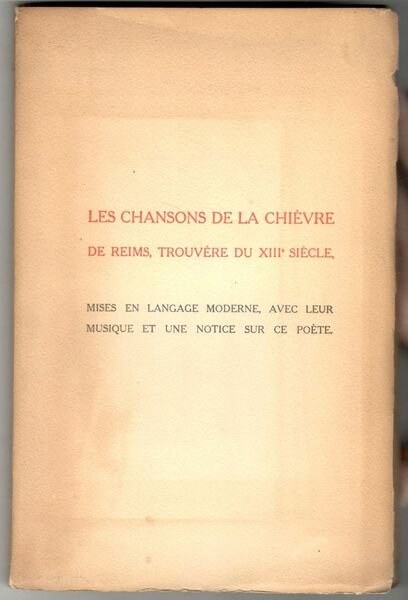 In 8°, pp. 57, (7). Brossura editoriale. Sulla copertina ingialliture dovute a esposizione alla luce e una leggera piega, per il resto copia in buono stato, a fogli chiusi. Con una testatina e due finalini colorati a mano. Notice sur La Chièvre de Reims par Frédéric Lachèvre. Les chansons mises en langage moderne par Madeleine Lachèvre. Notice sur la musique des chansons et notation moderne par Grillot de Givry. Tiratura di sole 30 copie numerate (n. 13).