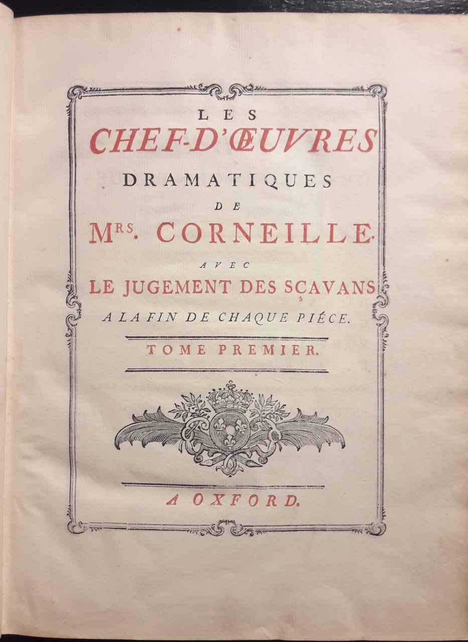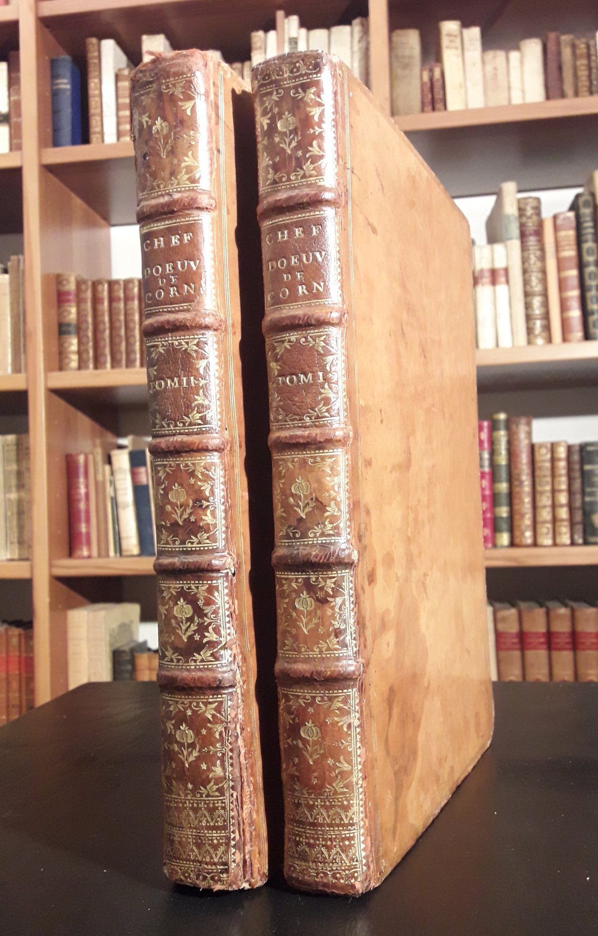 2 voll. In 4°, pp (4) 384; (2) 382(2). L'opera comprende: Cid, Horace, Cinna, Polyeucete, La mort de Pompée,Rodognone, Heraclius, Hothon di Pierre Corneille e Ariane e Le Comte d'Essex del fratello Thomas. Bella edizione. Frontespizi in rosso e nero. Testo inquadrato in elegante cornice con ampi margini. Bella legatura coeva in pelle, con nervature e fregi in oro ai dorsi. Leggermente danneggiate le cuffie del 2° vol. (Graesse, II, 267)