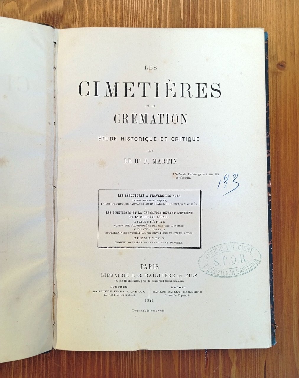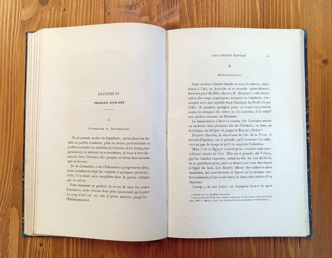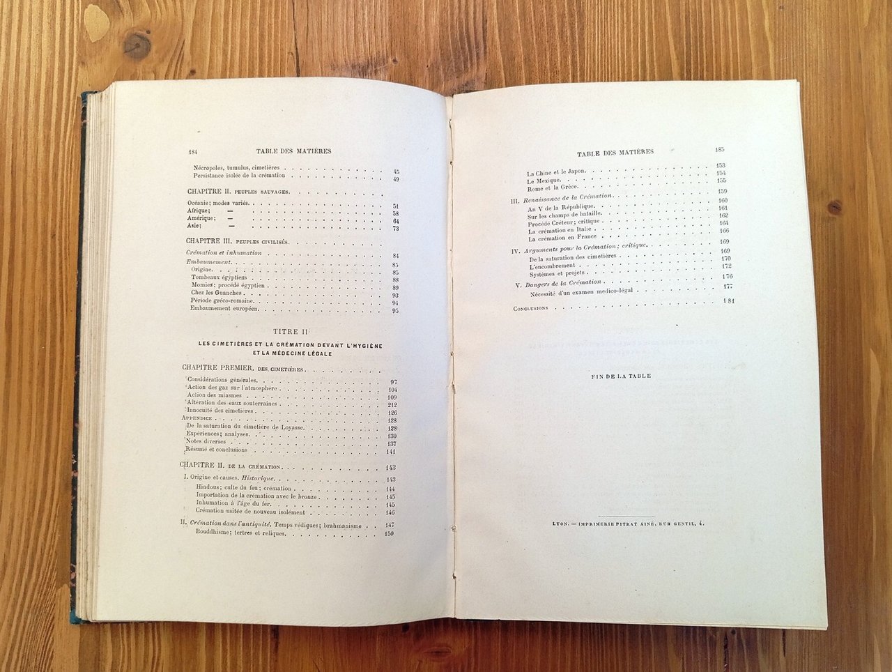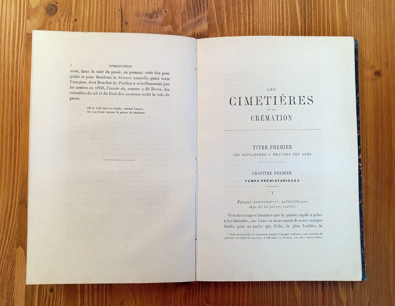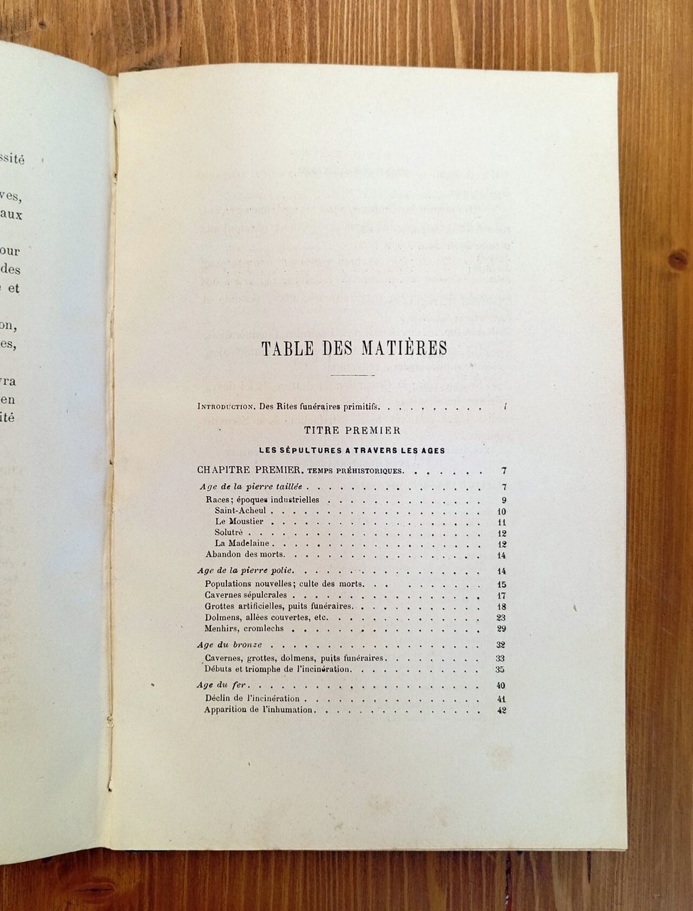 Edizione originale francese - Volume rilegato in coeva mezza pelle con titolo e filetti in oro al dorso, piatti marmorizzati, 185 pagine. Sommario (Table des matières): Les sépultures à travers les ages: Temps préhistoriques, Tribus et peuples sauvages ou barbares, Peuples civilisés - Les cimetières et la crémation devant l'hygiène et la médecine légale -- maggiori dettagli nelle immagini. Dorso brunito causa luce solare, timbro di biblioteca disciolta al frontespizio ed etichetta al piede del dorso, peraltro esemplare in ottimo stato di conservazione, paginazione fresca e legature ben salde.