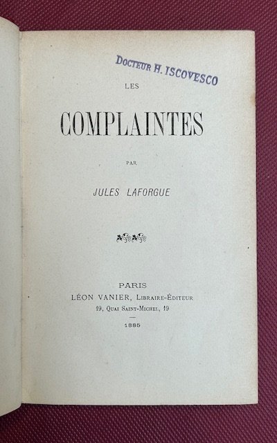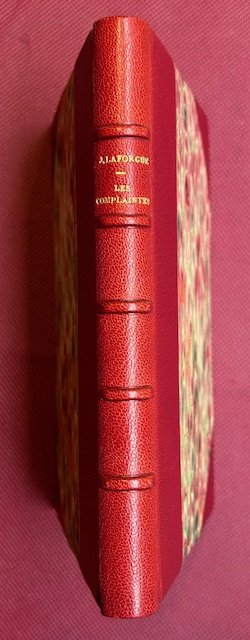 In-8° (175 x 110 mm), pp.145, (1), legatura in mezza marocchiono e angoli, dorso a cinque nervi con titolo in oro, piatti in bella carta decorata, taglio superiore dorato. Ex libris di biblioteca privata all'interno del piatto anteriore. Edizione originale Les Complaintes, che segna la fine del XIX secolo, riunisce varie poesie di denuncia di questo poeta difficilmente classificabile. Inventore del verso libero, erede del romanticismo, poeta decadente, simbolista, modernista, post modernista. La sua opera sconvolge le abitudini dei lettori giocando sul discorso poetico, sulla parodia, sulla contraffazione,. Ancorato allo spirito decadente di fine secolo che non è al passo con l'idea romantica di armonia, bellezza ed equilibrio. Nella sua opera Laforgue mostra con ironia i difetti e gli eccessi del romanticismo. Dei e dee, divinità, personaggi della storia Sacra vengono raffigurati in modo ridicolo. Pierrot è colui che vive altrove, un essere grigio, poco sentimentale con un cuore casto, irreale, triste e beffardo. Tra i temi trattati in queste poesie troviamo il decadentismo, il dolore di vivere legato al lamento, alle emozioni manifestate che portano non al sogno ad occhi aperti ma soprattutto al disgusto per la società, e ancora l'amore difficile e le donne, dove è disprezzato l'amore unilaterale.