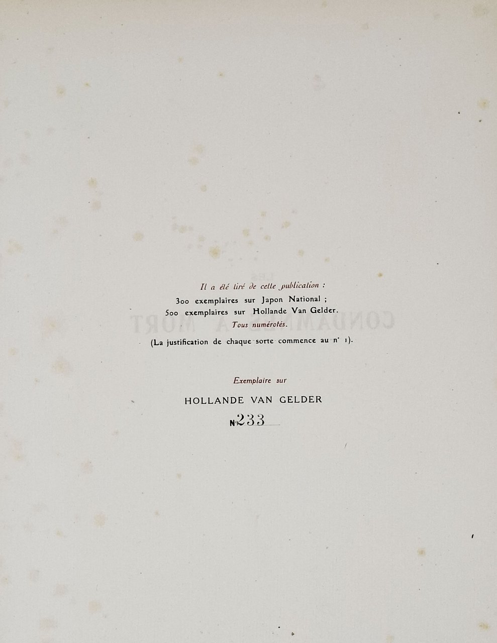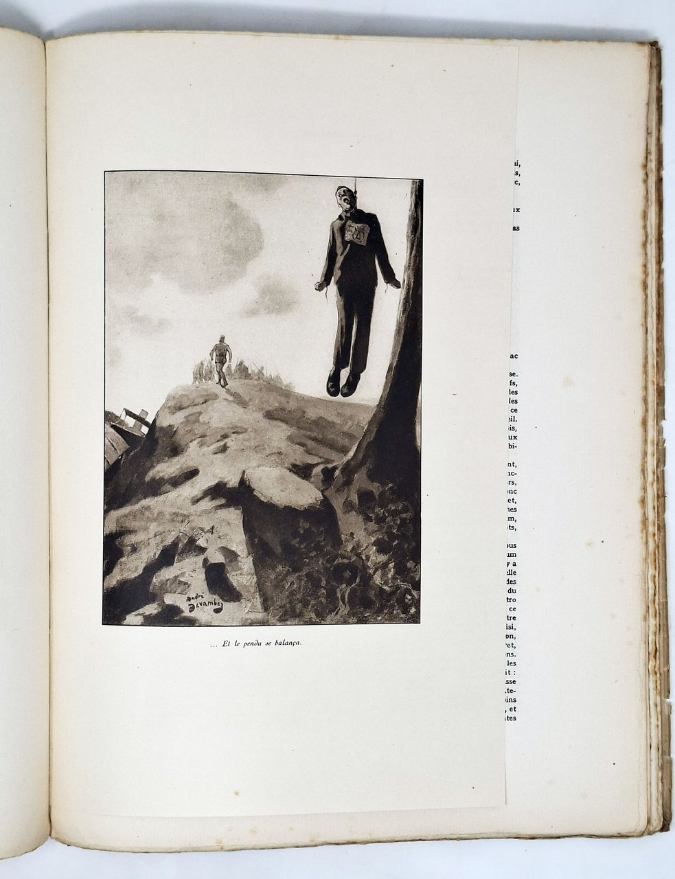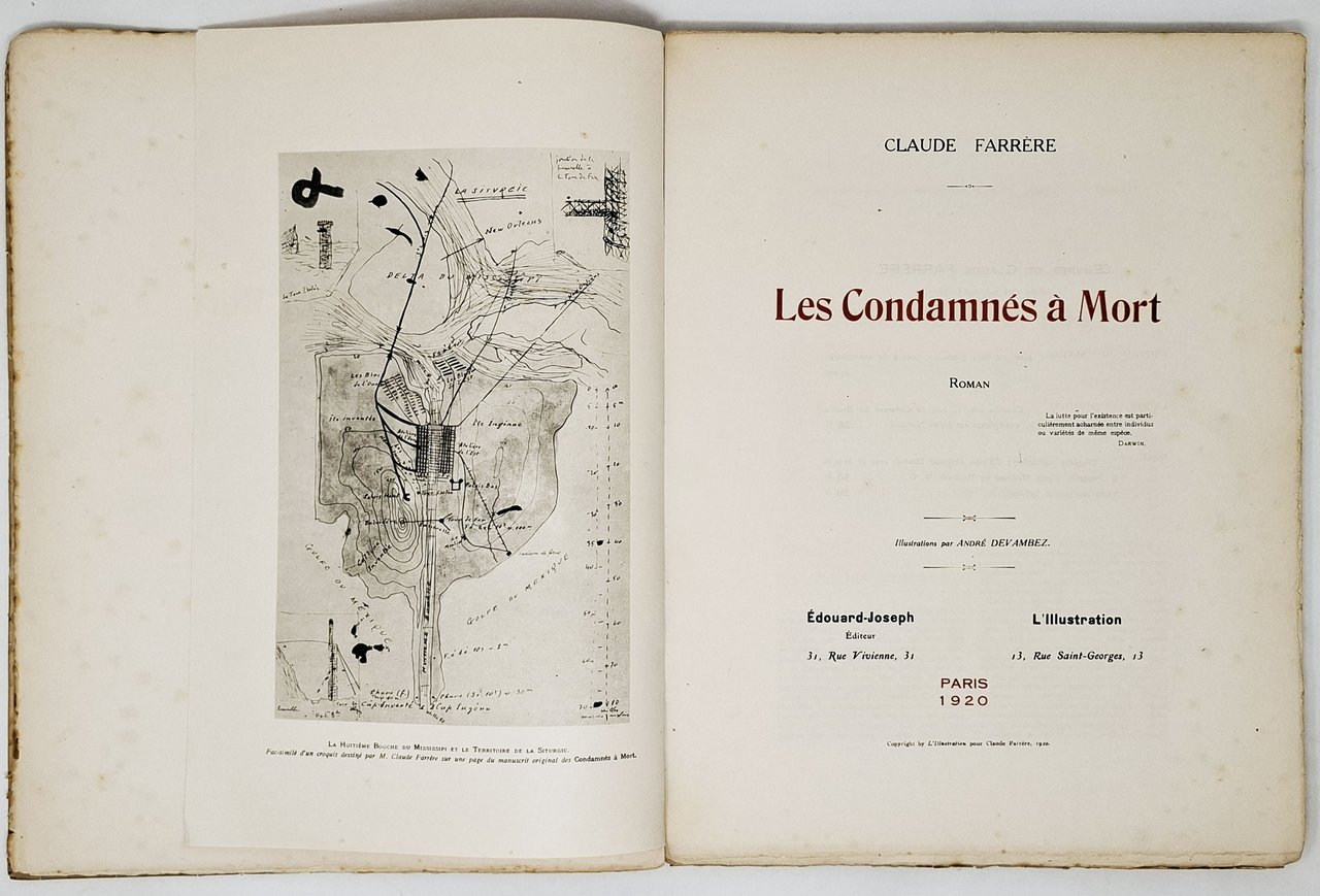 edizione originale, stampata a Parigi nel 1920, in tiratura limitata (800 esemplari numerati), esemplare numero 233 (sur Hollande Van Gelder). Finito di stampare il 6 novembre 1920. Illustrations de André Devambez. Molto particolare la veste editoriale con il testo stampato su due colonne in nero e rosso e le illustrazioni inserite fuori testo su fogli di dimensioni inferiori rispetto a quelle del testo. Lingua del testo: francese. Formato: 25,5 x 33 cm circa. Pagine: 83 + [6]. Stato di conservazione: strappetti e mancanze sulla camicia editoriale in carta velina, un taglio sul bordo inferiore della linea di attaccatura tra il dorso e il piatto anteriore, piccole mancanze sul vertice superiore e su quello inferiore del dorso, rare e piccole macchioline gialle (non deturpanti) ma, nel complesso, un buon esemplare in parte ancora a fogli chiusi.