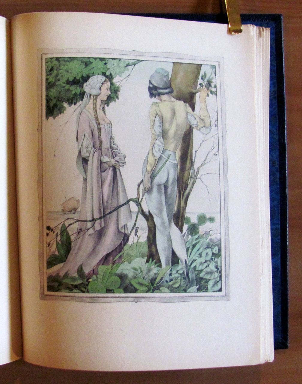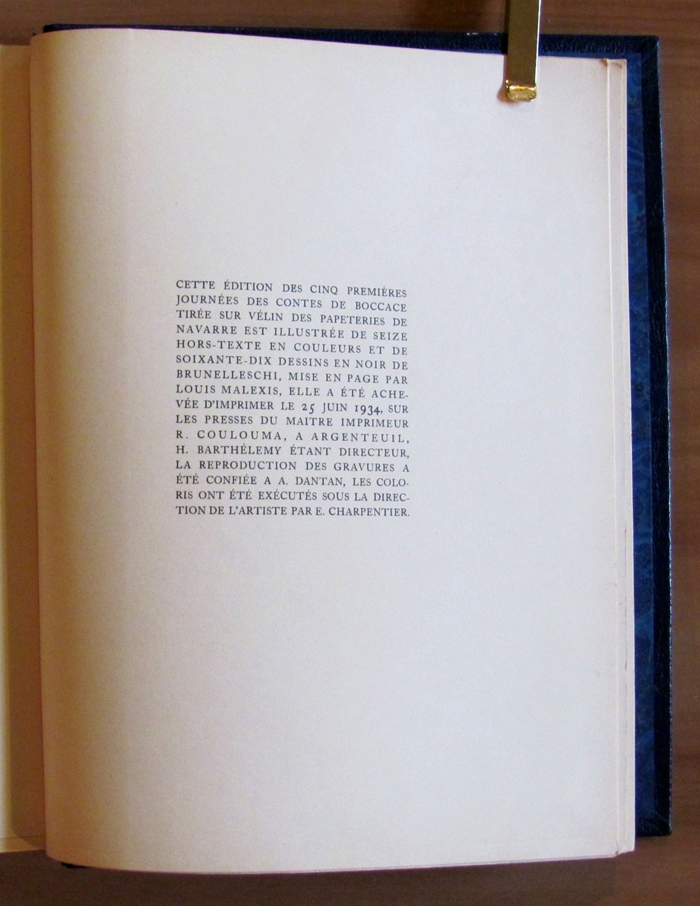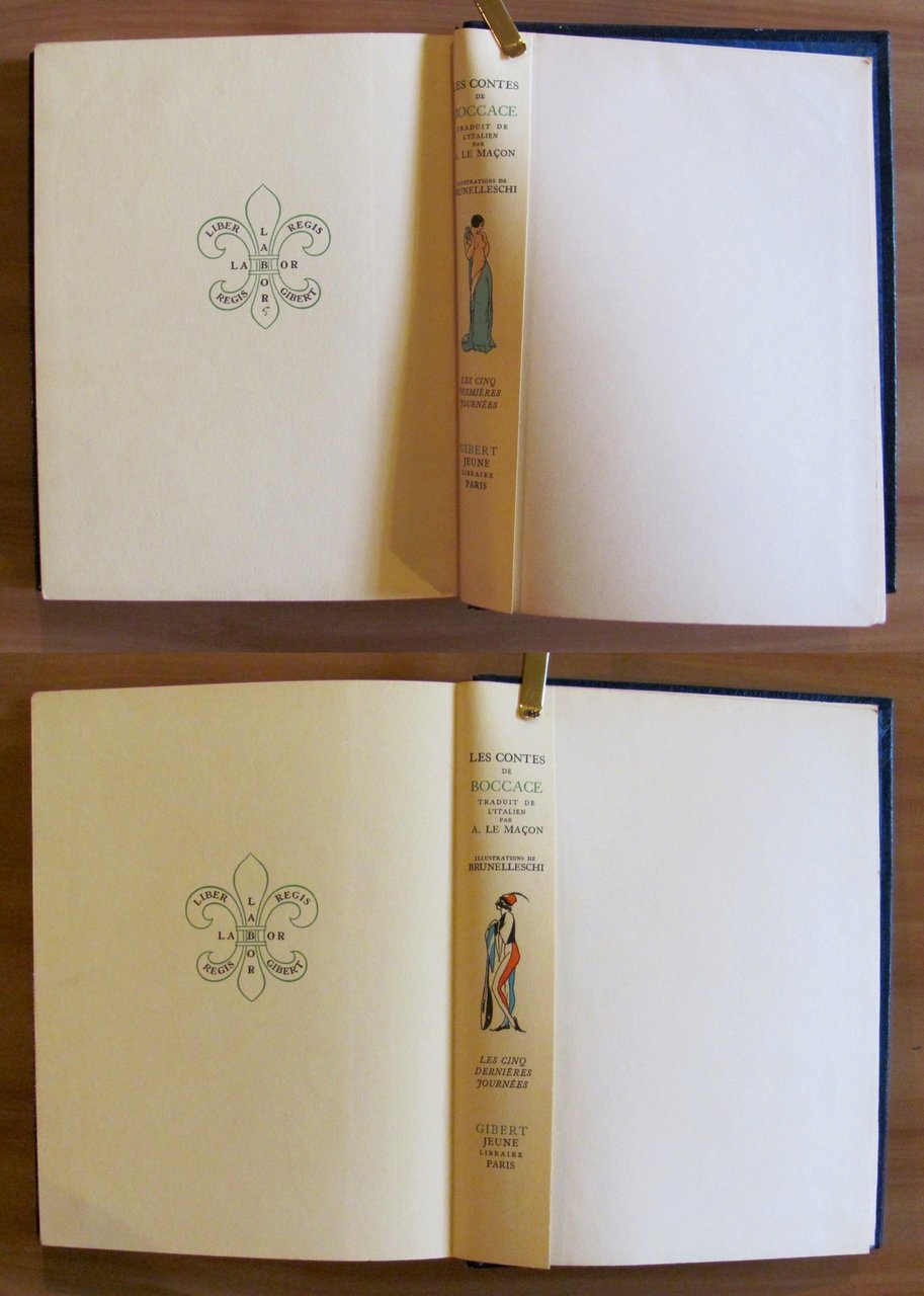 Vol. I - Les cinq Premières Journées; Vol. II - Les cinq Dernières Journées. 70 illustrazioni fra capilettera, testatine e finalini in b/n n.t. e 16 splendide tavole a colori f.t., per ciascun volume, di Brunelleschi. Libr. Gibert Jeune - Paris, I edizione 1934. Tiratura Limitata a 2500 Esemplari Numerati, nostro N° 530. Belle legature in pelle con nervi e titoli in oro al dorso inseriti rispettivamente in custodia cartonata con copertine ante-retro e dorsi conservati all'interno di ciascun volume. Ex-Libris applicati al risguardo in entrambi i volumi. Minime imperfezioni alle cuffie e alle cerniere dei dorsi ma libri perfettamente solidi e freschissimi. 21x26,5; pp.342+281. Rari ed entrambi in Ottimo stato. , Ottimo (Fine)