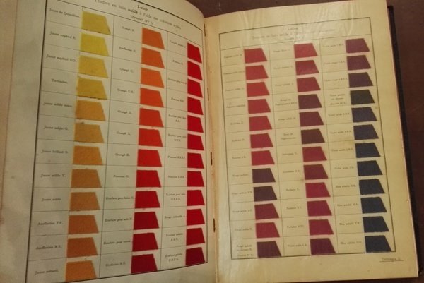 In 4 piccolo°, pp. 544+12. Legatura originale in mz pelle con titoli in oro al dorso. Bel catalogo commerciale della ditta di colori per tessuti Badish Aniline figurato da 16 composizioni con pezzi di stoffa, seta, cotone etcc. con varie gradazioni di colore. 2 tavole f.t. in nero con l'immagine degli impianti della fabbrica. Non comune. Ottimo stato di conservazione.