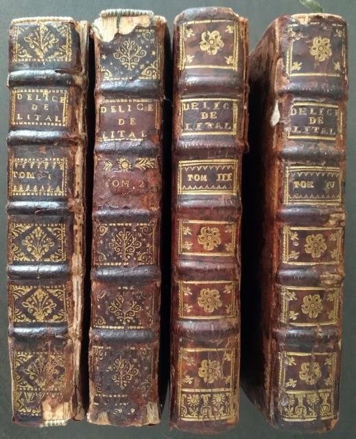 Compagnie des Libraires, Paris, 1707. Quattro volumetti in 8vo piccolo (cm 10 x 17), antiporte figurate a ciascun volume e completo delle tavole. Tome primo: pp. (14), 334 + (2); Tome secondo: pp. (2), 359; Tome terzo: pp. (2), 302; Tome quarto: pp. (2), 266 + (30). Contropiatti e fogli di guardia in carta marmorizz., legature in piena pelle con dorso a nervi, tagli in rosso. La raccolta contiene moltissime piccole vedute, spesso anche più volte ripiegate (molte si sono sciolte ma su ogni tavola è accuratamente indicato il tomo e la pagina a cui essa si riferisce), relative alle principali città italiane e ad alcuni monumenti che le connotano, anche se non sempre si tratta dei monumenti più noti, e ciò rende le tavole diverse e particolari rispetto a quanto ritroveremo in altre raccolte successive di questo tipo. Ciò a cui il collezionista avveduto dovrebbe prestare attenzione è anche la purezza dell’incipit al primo tomo, una sorta di fresca e genuina introduzione con cui l’autore spiega al pubblico francese quale sia stata la volontà d’intenti che ha animato questa descrizione generale d’Italia: voler istruire il pubblico francese con una guida che, fin’ora mancata, possa illustrare le bellezze e le rarità più degne di nota di questa bella parte d’Europa. Bisogna infatti considerare che questa guida si pone come di diversi anni antecedente rispetto a quelle, già più consolidate, che ritroveremo a partire dalla seconda del secolo e poi, a maggior ragione, nel secolo successivo, fino ad arrivare ai grandi volumi che caratterizzeranno la moda del “Grand Tour”. Usura delle legature, sciolto il front. al tomo III, la bianca, l’antip. e il front. al tomo IV (con alcune pieghe), sciolte alcune fra le tavole, che risultano comunque tutte sane e ben impresse, nell'insieme tutti i volumi sono ben conservati.