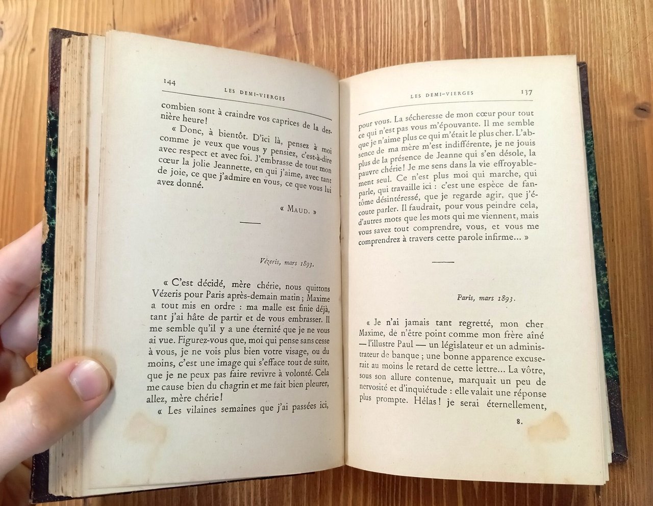 Prima edizione originale - Volume rilegato in mezza tela amatoriale con titolo in oro al dorso, viii-360 pagine. In apertura una prefazione dell'autore. Sporadiche fioriture alle carte, ordinari segni d'uso e del tempo, peraltro esemplare complessivamente ben conservato -- Nel 1894 Prévost pubblicò "Les Demi-Vierges" - divenuto poi il suo romanzo più noto - in cui affondava l'indagine nei profondi misteri dell'animo femminile. Questo romanzo, che fu un successo, ma anche uno scandalo, fu adattato a pièce teatrale e rappresentato al Théâtre du Gymnase Marie Bell, a maggio 1895; ne fu più tardi tratto un film. Il termine 'demi-vierge' divenne d'uso comune, ad indicare una ragazza affrancata da un'educazione restrittiva, ma rimasta tuttavia vergine. Seguirono altri romanzi, su identico tono antiverista, anti-naturalista.