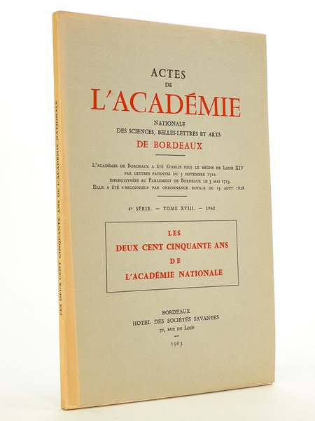 Les deux cent cinquante ans de l'Académie Nationale ( Actes de l'Académie Nationale des Sciences, Belles-Lettres et Arts de Bordeaux, 4e série, Tome XVIII, 1962 )