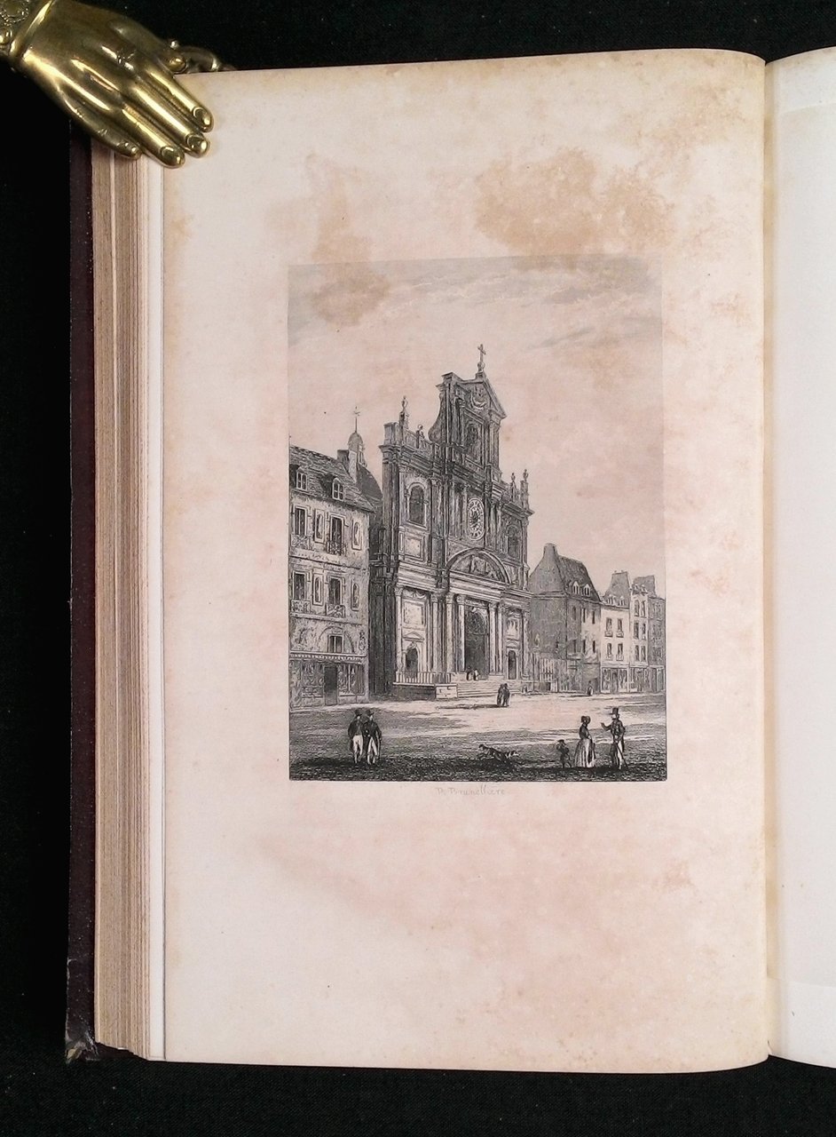 8vo (252x160 mm); leg. in mezza pelle rosso-bruno, dorso liscio, falsi nervi e titoli in oro al dorso, piatti in percalina, guardie in carta marmorizzata, tagli puntinati a spruzzo di color rosso; pp. XIV, 320; 20 incisioni su acciaio f.t. in b.n., protette da veline, illustranti le chiese di Parigi, tra cui: Notre-Dame, S.-Germain L' Auxerrois, S.-Etienne-du-Mont, La Sainte-Chapelle, S.-Sulpice, S.-Merry, S.-Germain-Des-Pres, S.-Gervais.-S.-Protais, S.-Nicolas-Des-Champs, S.-Eustache, S.-Paul.-S.-Louis, Notre-Dame-De-Lorette, S.-Roch, S.-Thomas-D'Aquin, S.-Severin, Saint-Medard, S.-Louis des Invalides, N. Dame-des-Victoires, S.-Jacques-La-Boucherie, La Madeleine. Prima edizione poco diffusa di questa opera storica a cura dell'abbate Jean-Baptiste-Etienne Pascal, che descrive ed illustra le chiese di Parigi. -- 1 vol. In-8. demie-basane glacée rouge. dos à nerfs ornés. 20 grav. sur acier sous serpentes, plus ou moins brunies, rosseurs légères, bel ex. bien relié. -- Rif.: Non censito in ICCU. OCLC, 6925272. Cond.: Lievi tracce d'uso, cuffia sup. leggermente danneggiata, bruniture e fioriture delle tavv. f.t., dovute al tipo di carta impiegato. Opera in buone condizioni generali.