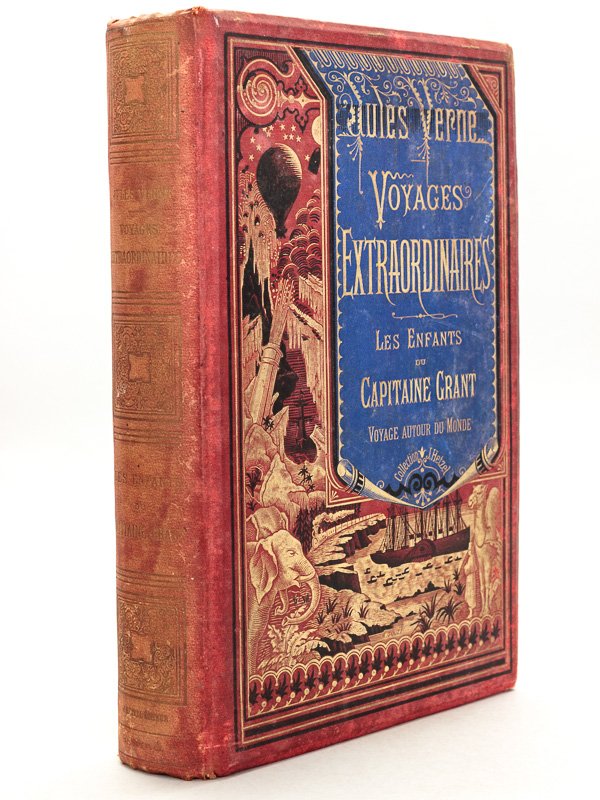 1 vol. grand in-8 cartonnage à la bannière bleue, plats biseautés, Voyages Extraordinaires, Bibliothèque d'Education et de Récréation, J. Hetzel et Cie, s.d., [circa 1878] 624 pp. avec catalogue E.L. Cartonnage à la bannière aux plats biseautés de type 3 avec son second plat de type Lenègre b1 (Jauzac). Etat moyen (cartonnage frotté avec mouill. 4 feuillets débrochés et abîmés). Prix en l'état.
