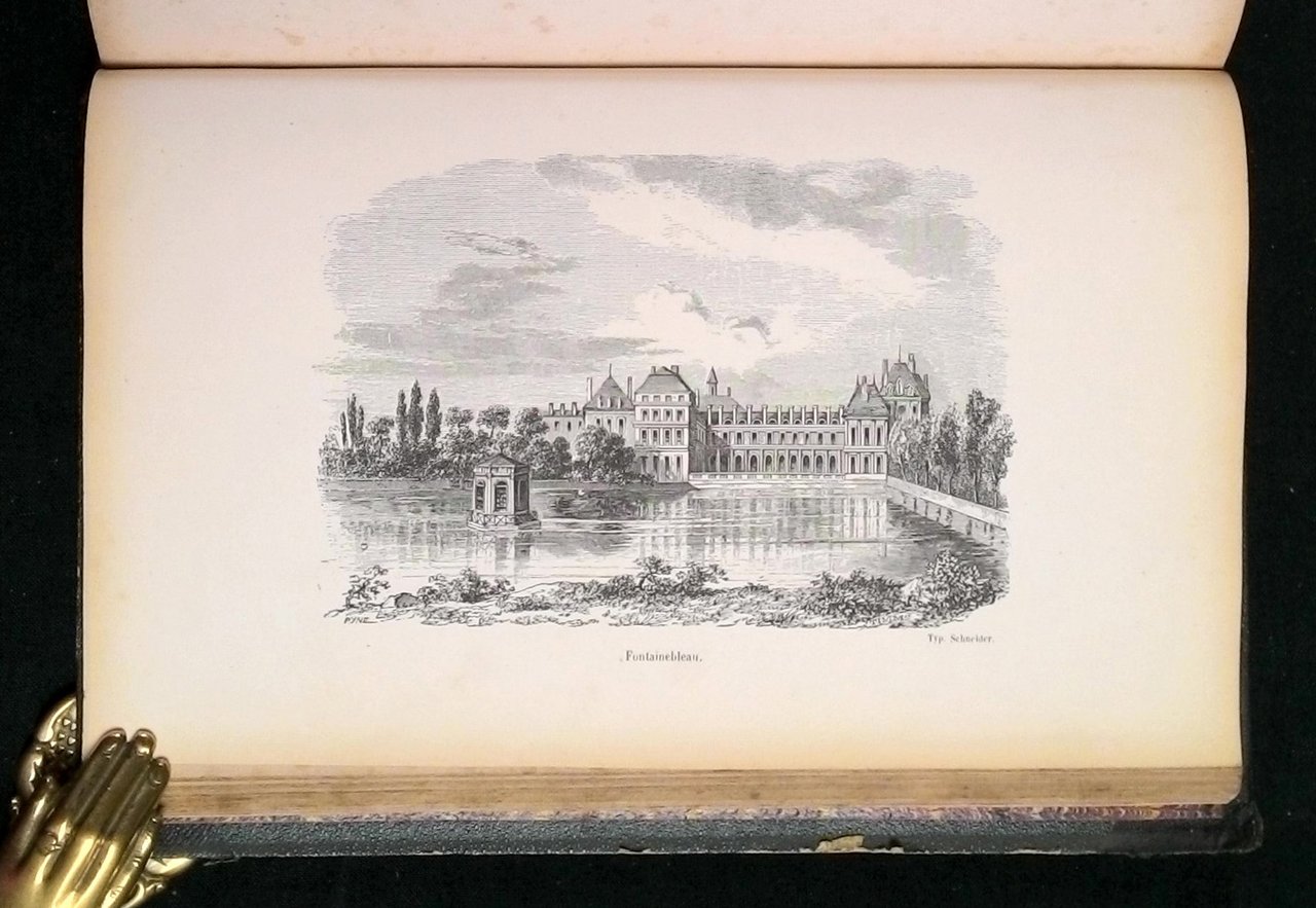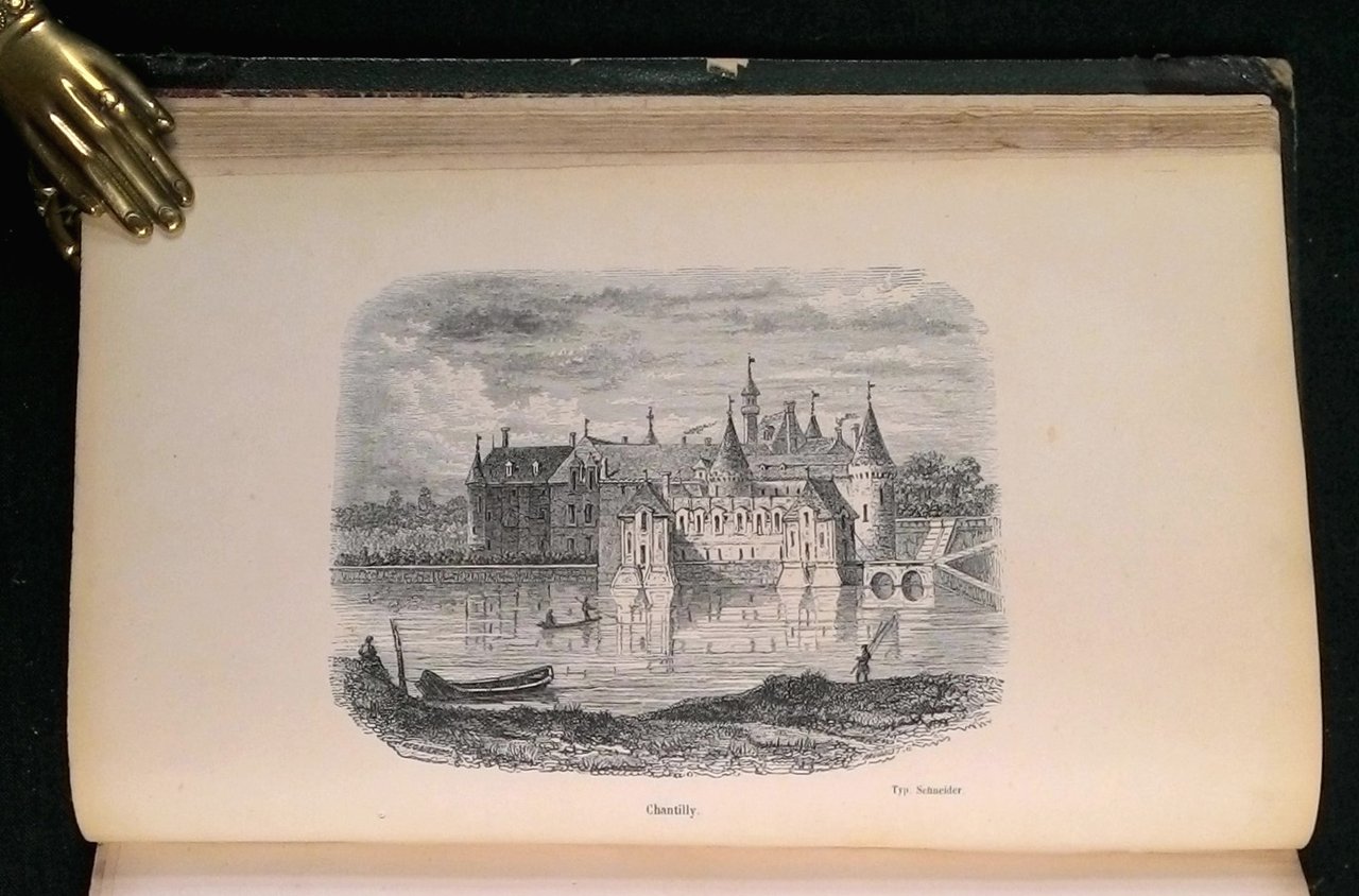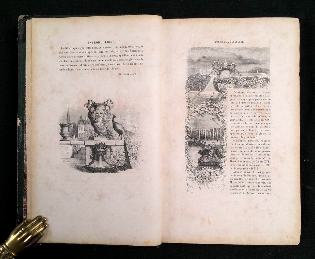 8vo (268x170 mm); leg. in mezza pelle nera con angoli, dorso a nervi, decori e titolo in oro al dorso, piatti in percalina, carte marmorizzate alle guardie; pp. VI, 490, (4); 28 incisioni su legno fuori testo e numerose nel testo, marca tipografica al frontespizio. Prima edizione di quest’opera illustrata sui dintorni di Parigi, paesaggi, monumenti, storia, costumi, cronache e tradizioni. L’anno di pubblicazione non è indicato, ma dovrebbe essere il 1840. -- Demi-basane, dos a nerves, orne, tres nombreuses vignettes sur bois et 28 planches hors-texte dont le frontispice. Rousseurs. Illustrations d'apres BARON, NANTEUIL, REGNIER, MOYNET, etc. Les textes sont de NODIER, LURINE, ARAGO, SANDEAU, JANIN, A. HOUSSAYE, BRIFFAUT, Etc. VICAIRE VI, 172. Bel exemplaire du premier tirage malgré ses rousseurs. -- Rif.: IT\ICCU\BA1\0018370. OCLC, 489741074. Cond.: Lievi tracce d'uso, angoli consumati, rossori e fioriture. Opera in buone condizioni generali.