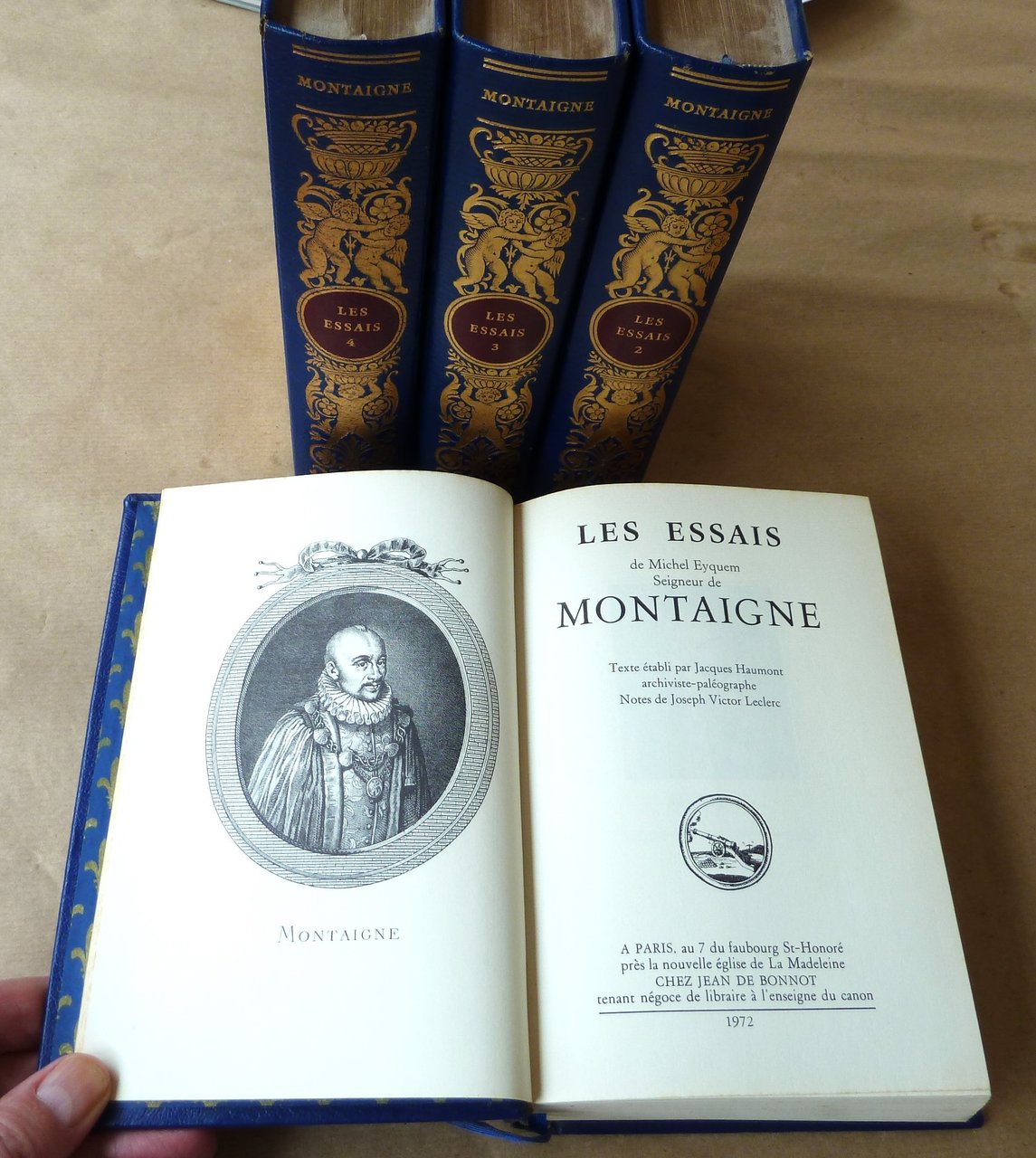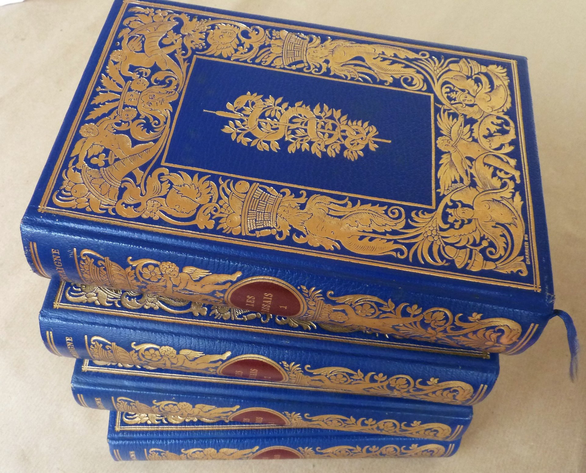 Ensemble complet de 4 forts volumes de format in 8° de T. I: 1 f. (ex-libris); 5 ff. ( faux-titre, titre, portrait frontispice, autre portrait); VIII pp. (avertissement); XXXII pp. (étude sur Montaigne, biographie); 500 pp. (texte). T II: 1 f. (ex-libris); 5 ff. ( faux-titre, titre, portrait frontispice, autre portrait);534 pp. T. III: 1 f. (ex-libris); 5 ff. ( faux-titre, titre, portrait frontispice, autre portrait); 534 pp. T. IV: 1 f. (ex-libris); 5 ff. ( faux-titre, titre, portrait frontispice, autre portrait); 548 pp. Reliure de l'éditeur en plein cuir; décor doré. Bel état. Voir les photos.