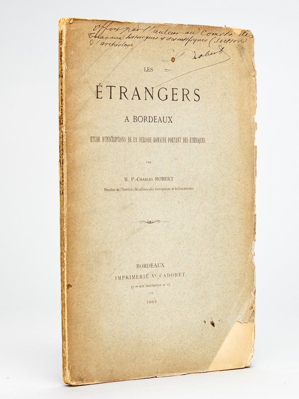 1 vol. in-8 br., Imprimerie Ve Cadoret, Bordeaux, 1883, 109 pp. Envoi de l'auteur en couv. Etat satisfaisant (couv. frottée avec petits mq. en dos et plat sup.). Peu courant.