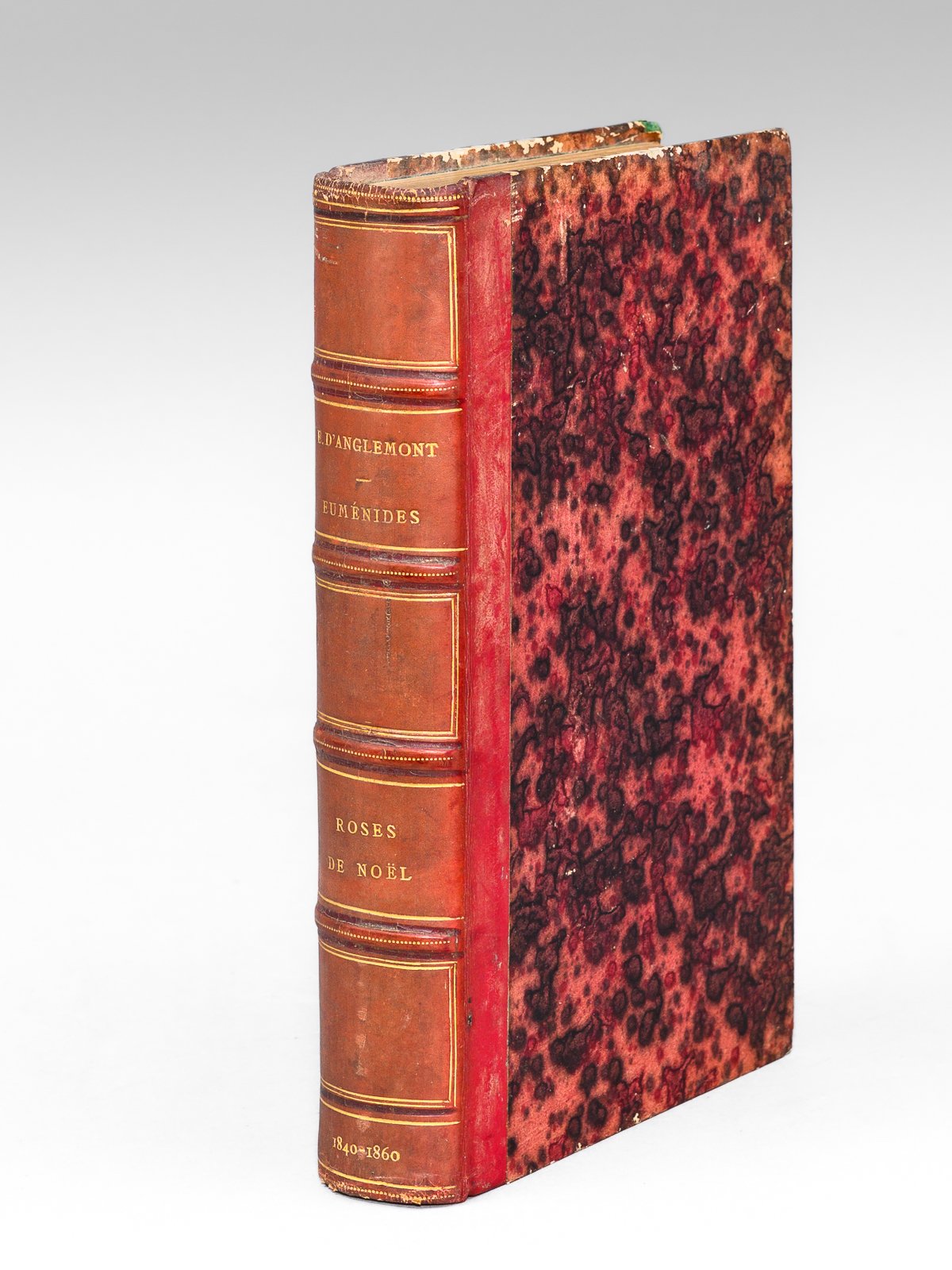1 vol. in-8 reliure de l'époque demi-veau rouge, dos à 4 nerfs, dates en queue : Euménides, Deuxième édition, Chez Philippe, Paris, 1840, VIII-338 pp. [Suivi de : ] Roses de Noël, E. Dentu, Paris, 1860, VII-324 pp. Chacun des 2 ouvrages est dédicacé par l'auteur romantique et poète Edouard d'Anglemont (1796-1876) "à son ami Jules Lacroix." et "à Jules Lacroix, témoignage de sympathie et de confraternité". Belle provenance pour ce recueil peu commun. Bon état (reliure un peu frottée).