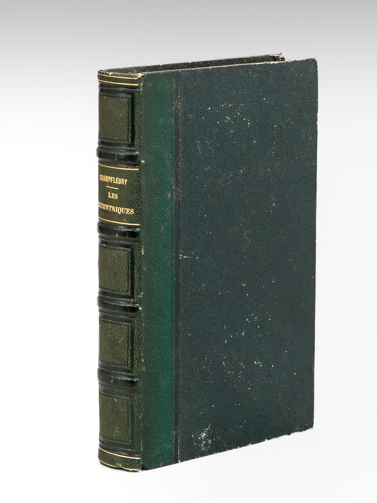 1 vol. in-12 reliure de l'époque demi-chagrin vert, dos à 4 nerfs, Michel Lévy Frères, Paris, 1852, 2 ff., 373 pp. et 1 f. Bon état pour cette édition originale des "Excentriques", précédée d'une longue dédicace imprimée à Honoré Daumier (rouss. parfois fortes). Les "excentriques" et les "grands hommes du ruisseau" évoqués par Champfleury sont : Da Gama Machadao, Jean Journet, Lucas, Lamiral, Cambriel, le musicien Dubois, Rose-Marie Sardat, Jupille, Berbiguier, Carnaval, "l'élève de Moreau", Miette, Canonnier, l'abbé Châtel, Bug-Jargal, Cadamour et "l'homme aux figures de Cire". Vicaire, II, 180