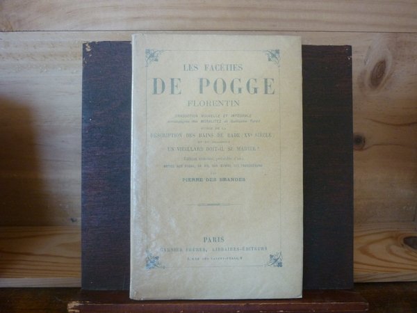 LXIX-478 pp. Traduction nouvelle et intégrale accompagnée des moralitez de Guillaume TARDIF suivie de la description des bains de Bade (XVe siècle) et du dialogue un vieillard doit-il se marier ? Edition annotée, précédée d'une notice sur Pogge, sa vie, son oeuvre, ses traducteurs par Pierre DES BRANDES