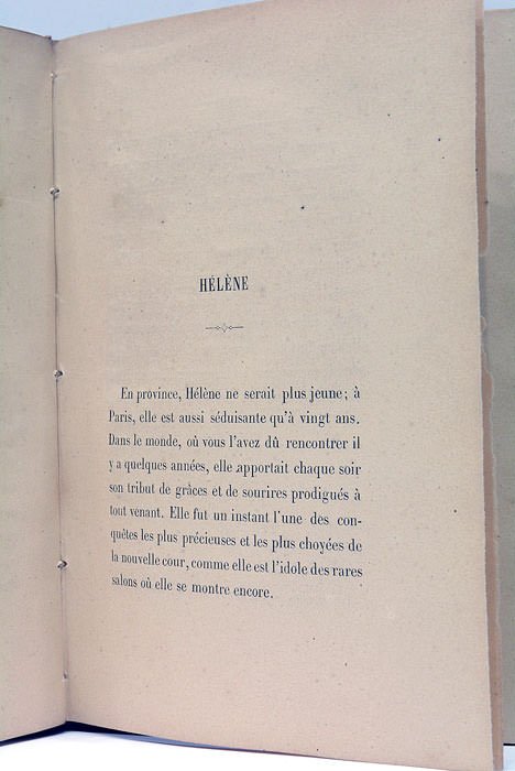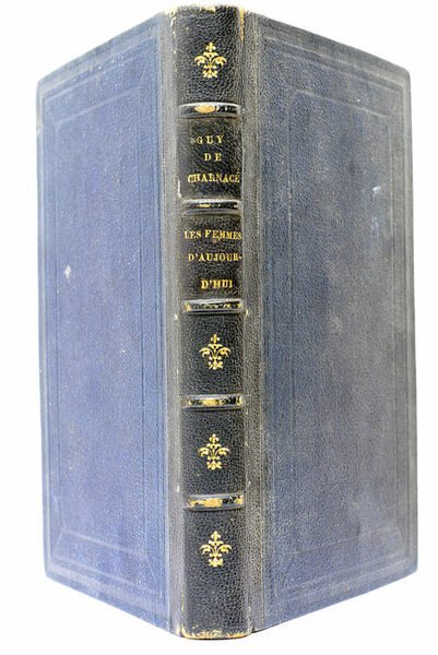 VIII. 214 pages. (19x12,5 Cm). Demi-cuir. Plats en percaline décorés à froid. Dos à nerfs doré. Coins et coiffes émoussés. Une petite partie de la marge de pages 1 et 2 arrachée. Rares taches et rousseurs. Papier bruni. Un livre de louanges à la femme par le grand romantique Guy de Charnacé. Il trace dans ce livre des jolis portraits de 44 femmes de l'époque. Sur la page du faux-titre De Charnacé a laissé une dédicace à Mademoiselle Claire Campbell daté de Février 1867.
