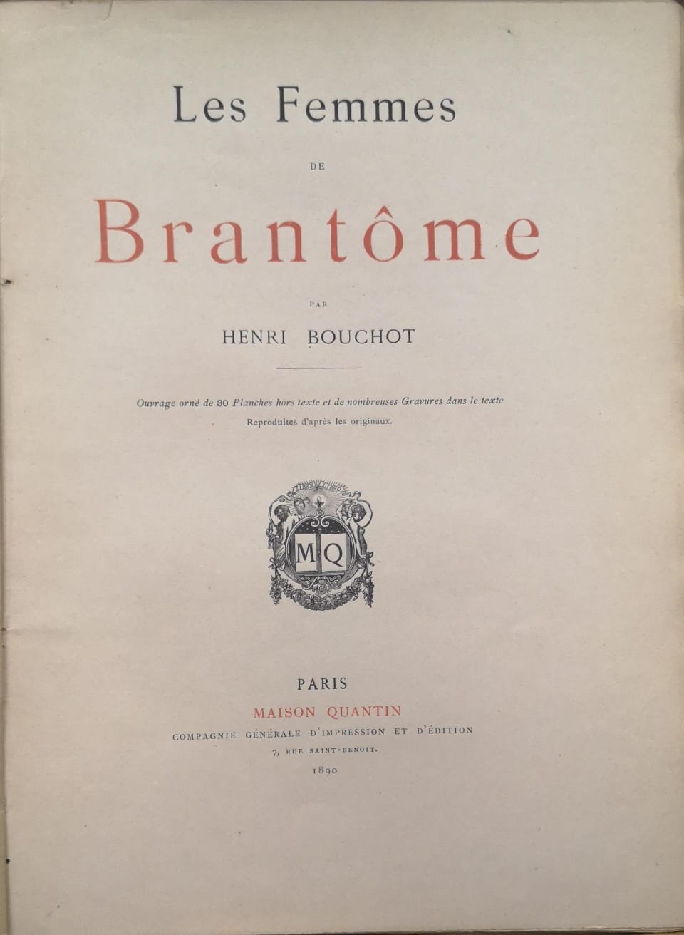 In-4 p. (mm. 290x215), mezza pelle con angoli coeva, fregi e titolo oro su dorso a cordoni, pp. 290, con ritratto allantiporta di Pierre de Bourdeille, 30 tavole fuori testo e numerose incisioni in bianco e nero nel testo.Esemplare intonso, in buono stato.