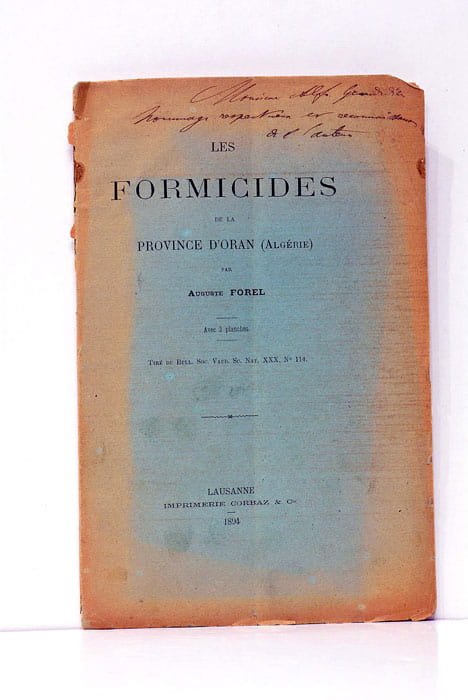 45 pages. 2 planches. (23x15 Cm). Broché. Couverture imrpimée. Envoi de l'auteur sur la première couverture. Petits accrocs et manques, Etude et comparaison de la faune myrmécologique de la Tunisie et d'Algérie orientale. Tiré du Bulletin de la Société Vaudoise des Sciences Naturelles, Nº 144, 1894. Exemplaire non-coupé, bien conservé.