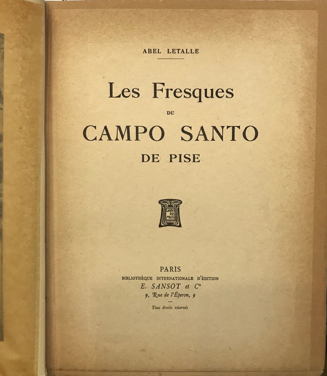PrŽcieuse Žtude consacrŽe aux fresques du cŽl�bre cimeti�re de Pise, dont une grande partie fut dŽtruite en 1944. Essai critique illustrŽ de 36 reproductions en noir et blanc, hors-texte. Legatura in mezza tela con piatti decorati, pp 200, con 36 fotoincisioni in nero fuori testo. Capitoli dedicati a Buonamico Buffalmacco, Andrea Orcagna, Pietro Lorenzetti, Simone Martini, Andrea da Firenze, Antonio Veneziano, Spinello Aretino, Francesco da Volterra, Pietro di Puccio, Benozzo Gozzoli. Edizione 1910, Collezione "Nouvelle Collection Artistique"
