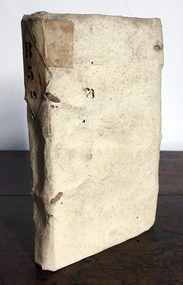 In 12mo (mm 155x86); pp. 333, [3]. Segnatura: A6 B-Z6 Aa-Ee6. Occhietto, segni di tarlo alle prime ed ultime 3 carte, che interessano solamente poche lettere. Cartonato coevo con nervi passanti, tassello cartaceo riportante la collocazione. Minime mancanze al dorso e piccoli segni di tarlo ai piatti. Nel complesso buona copia intonsa e parzialmente ancora a fogli chiusi.