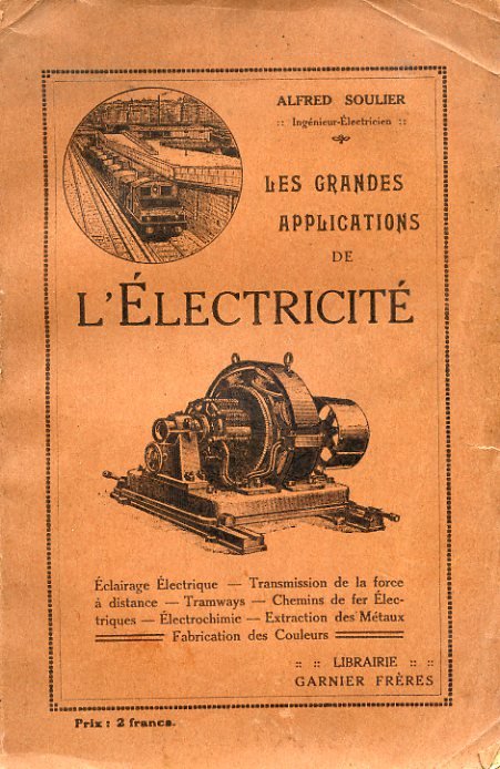 In-16°, pp. XXII, 246, brossura editoriale color mattone con illustrazioni xilografiche. 73 xilografie n.t. Bell'esemplare a fogli chiusi. Decima edizione, riveduta e aumentata, di questo studio sulle applicazioni dell'elettricità. Indice: 1. Les sources industrielles d'électricité et les transformateurs : Les sources industrielles d'électricité - Les transformateurs - Choix du courant suivant les applications - 2. Transmission de l'énergie électrique à distance : L'éclairage des villes - Transmission de la force motrice à distance, les moteurs électriques - Les canalisations pour la transmission de l'énergie électrique à distance - Les appareils de protection des lignes de distribution d'énergie électrique - Les grandes usines de production de l'énergie électrique - Transmission de la force motrice dans les usines et les ateliers - 3. La traction électrique : Avantages de la traction électrique - Tramways électriques - Les chemins de fer électriques - Automobiles électriques (voitures électriques) - 4. L'électrochimie : Extraction des métaux de leurs minerais - Fabrication des produits chimiques et des couleurs - Electrothermie - Production de l'acide nitrique par les décharges électriques.