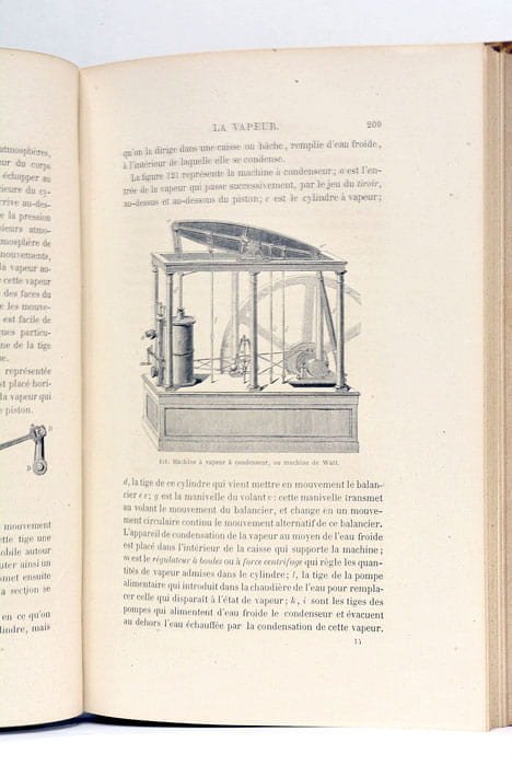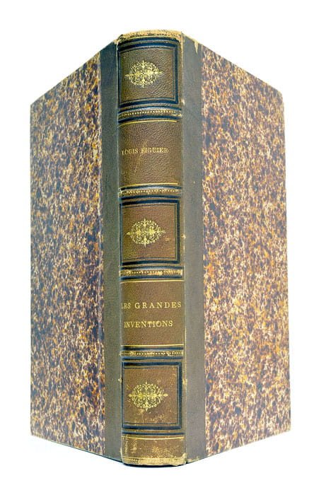 3 feuillets. 431 pages (24,5x16 Cm). Demi-cuir. Dos à 4 nerfs. Fleurons, titre et auteur dorés. Louis Figuier est le vulgarisateur scientifique le plus prolifique du xixe siècle, célèbre par le nombre et la qualité des articles de revues et des ouvrages qu'il a publiés de 1848 à 1894. Ce livre, un des plus complets de Figuier, décrit les grandes inventions anciennes et modernes dans des nombreux domaines: de l'imprimerie, de la gravure, de la lithographie et de la fabrication du papier, poudre à canon, la boussole, horloges et montres, porcelaine, poterie et verre, lentilles, télescopes, microscopes, photographie et stéréoscopes, baromètres et thermomètres, ingénerie de la vapeur et de l'électricité, éclairage, montgolfières, puits artésiens et drainage, ponts suspendus et la machine à tisser de Jacquard. Quelques taches de rousseurs au début de l'ouvrage. Sinon: exemplaire en très bon état.